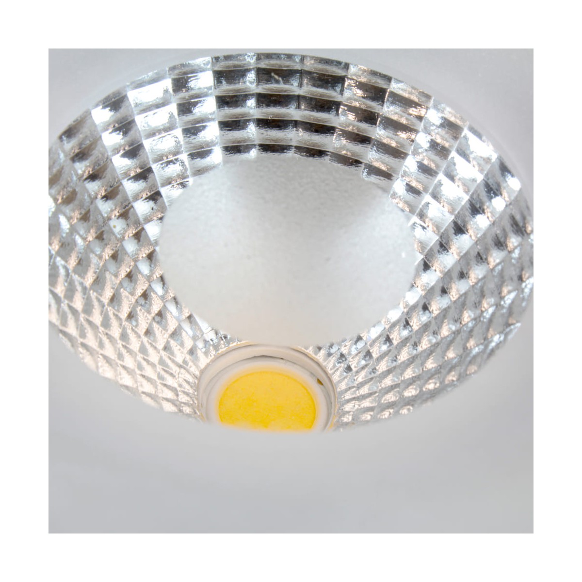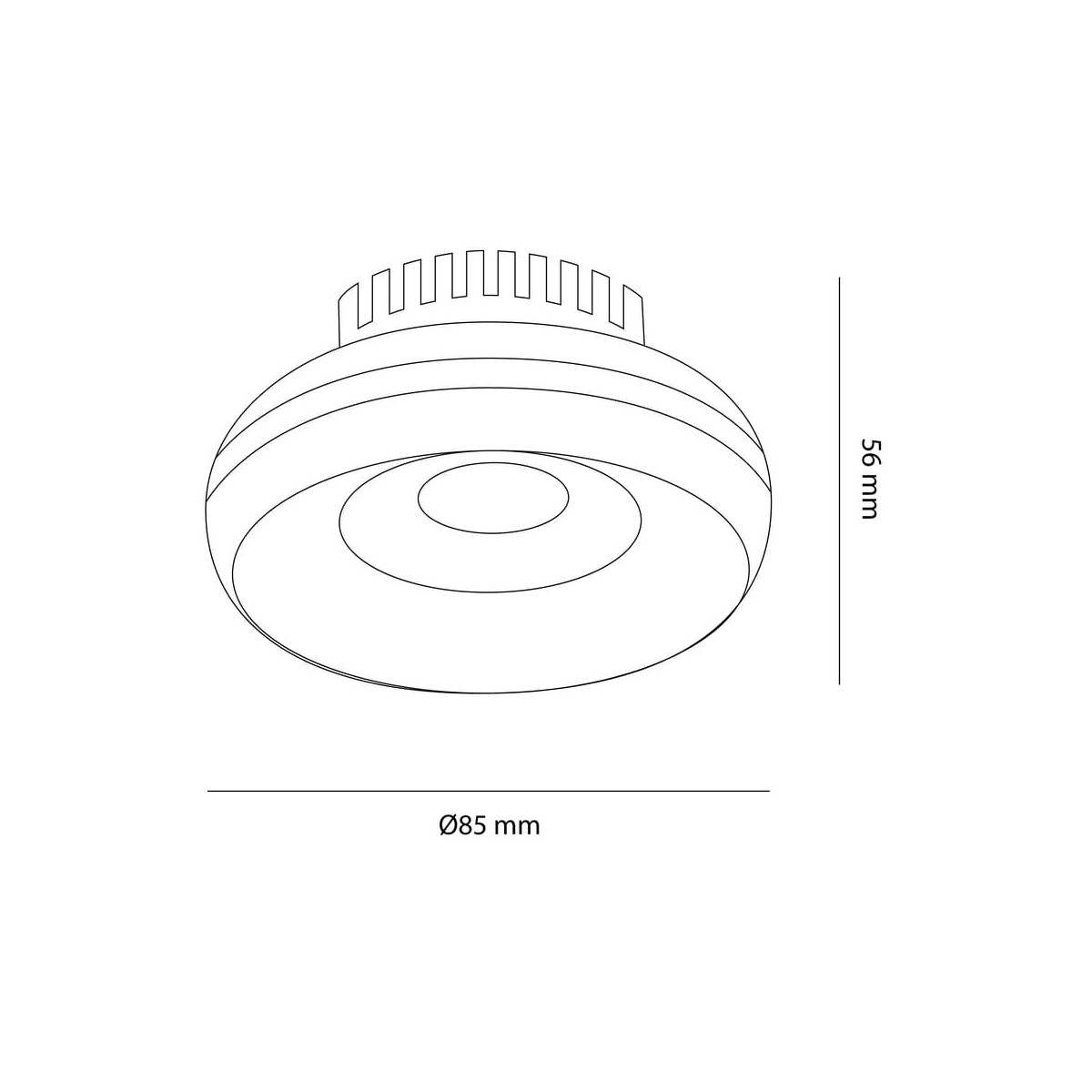 Decorative recessed spotlight with integrated 6W LED lighting with neutral light in 4000°K with high optical comfort. Once installed, the spotlight has a surface of 5.5 cm with a thin translucent strip that lets the light out from the sides. It has a cut-off diameter of 6.5 cm and an outer diameter of 8.5 cm. It is IP44 rated, allowing it to be installed in bathrooms and outdoors.