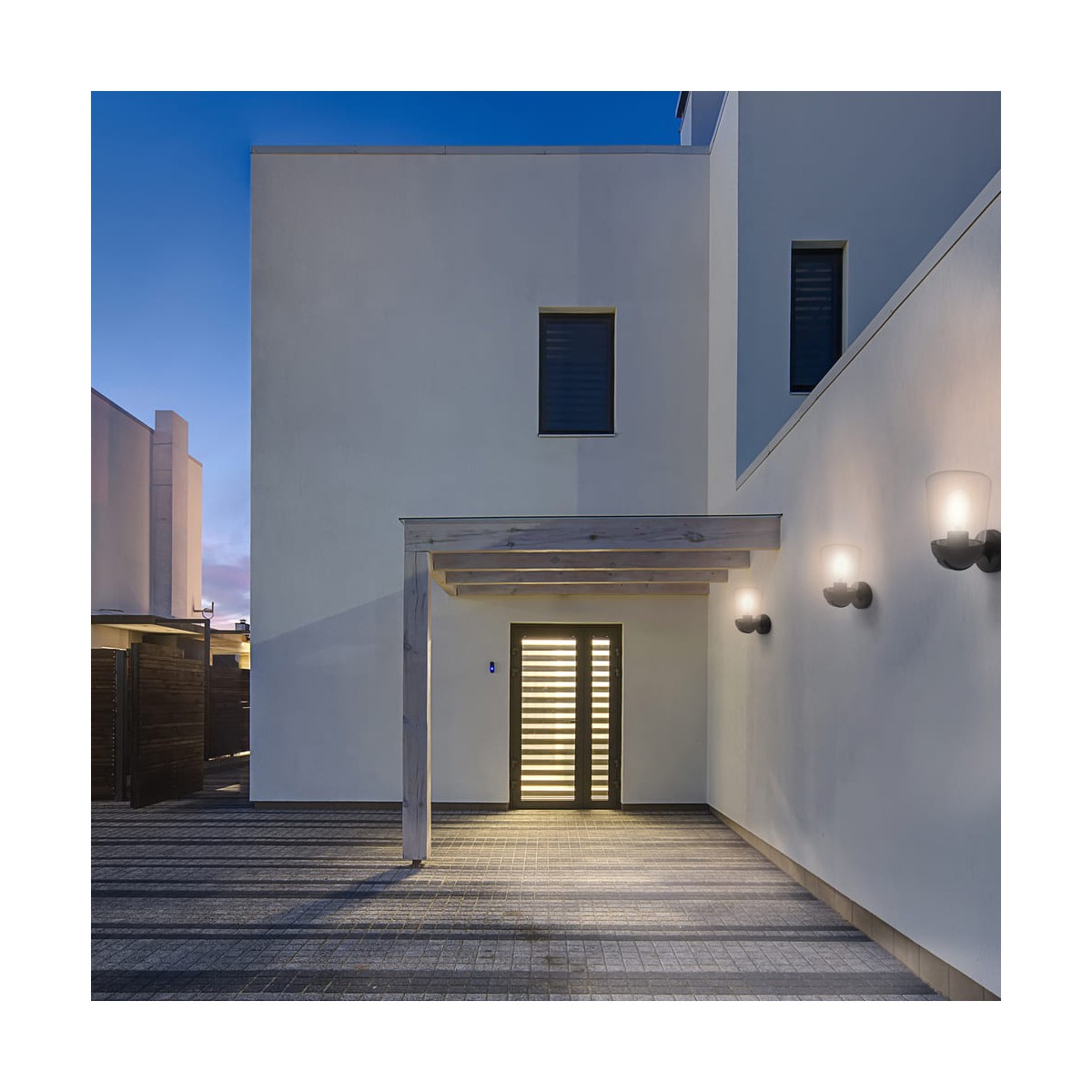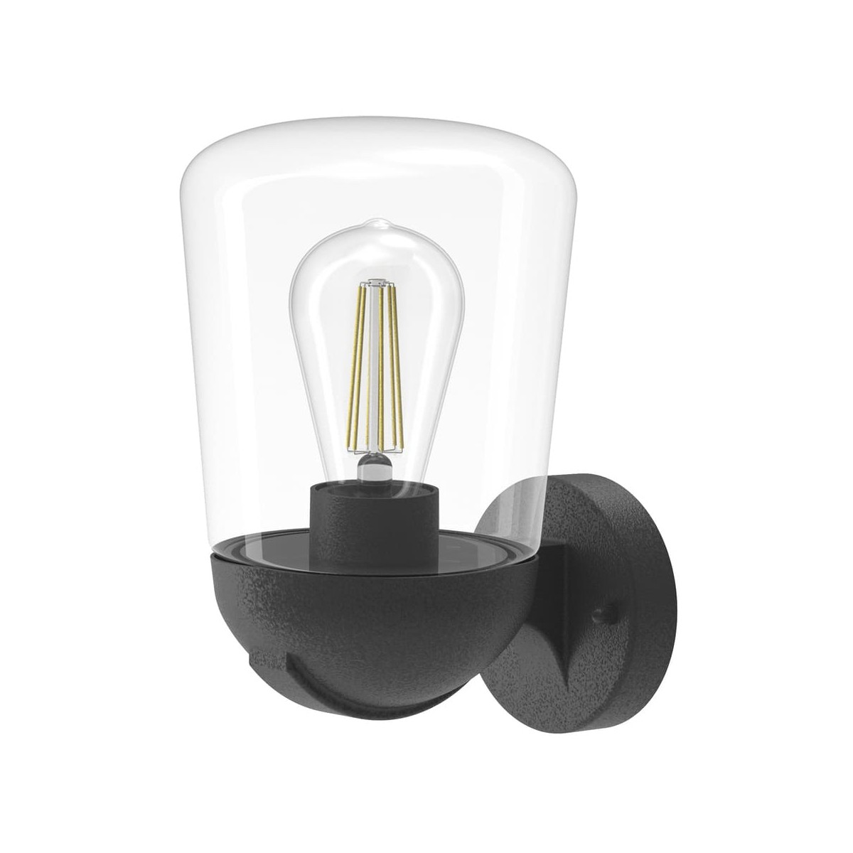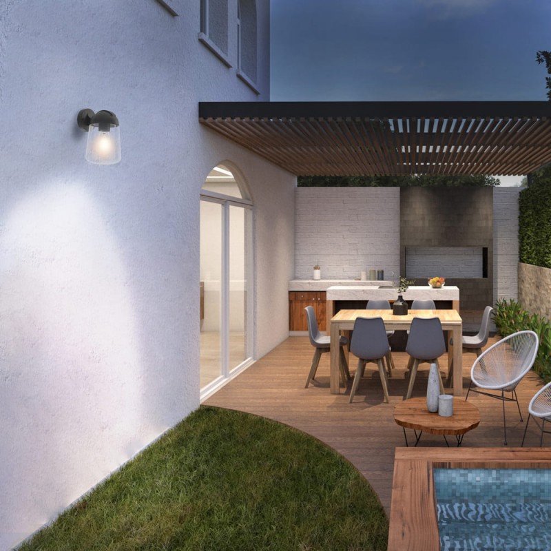 Wall light suitable for outdoor use with IP44. Black lacquered aluminium structure with transparent glass shade. For E27 bulb, not included. Can be combined with Nera hanging lantern.