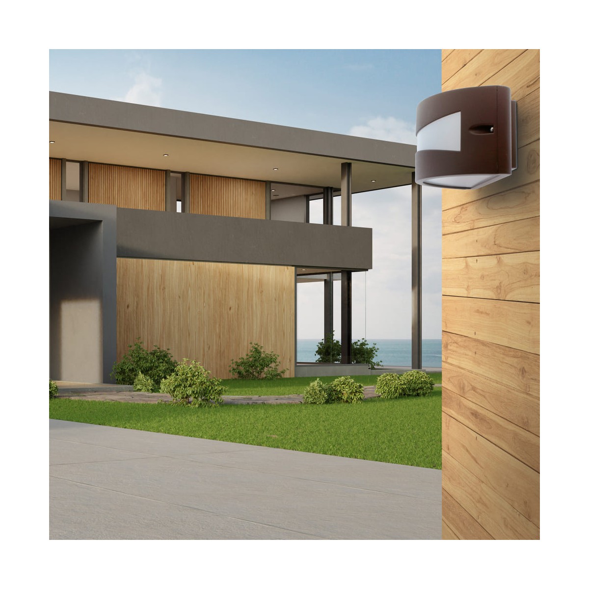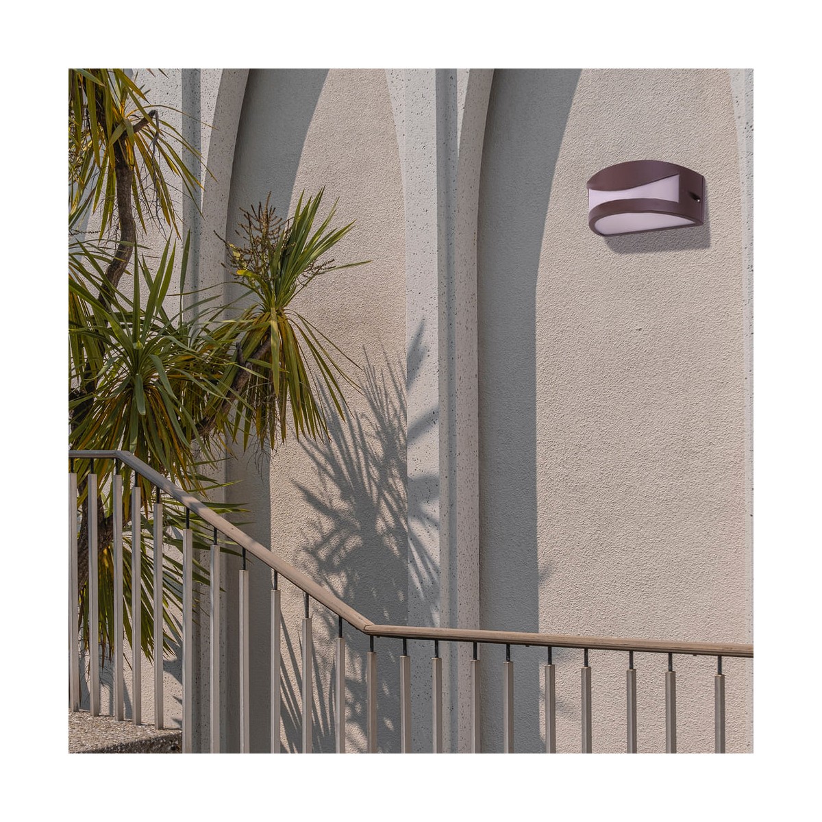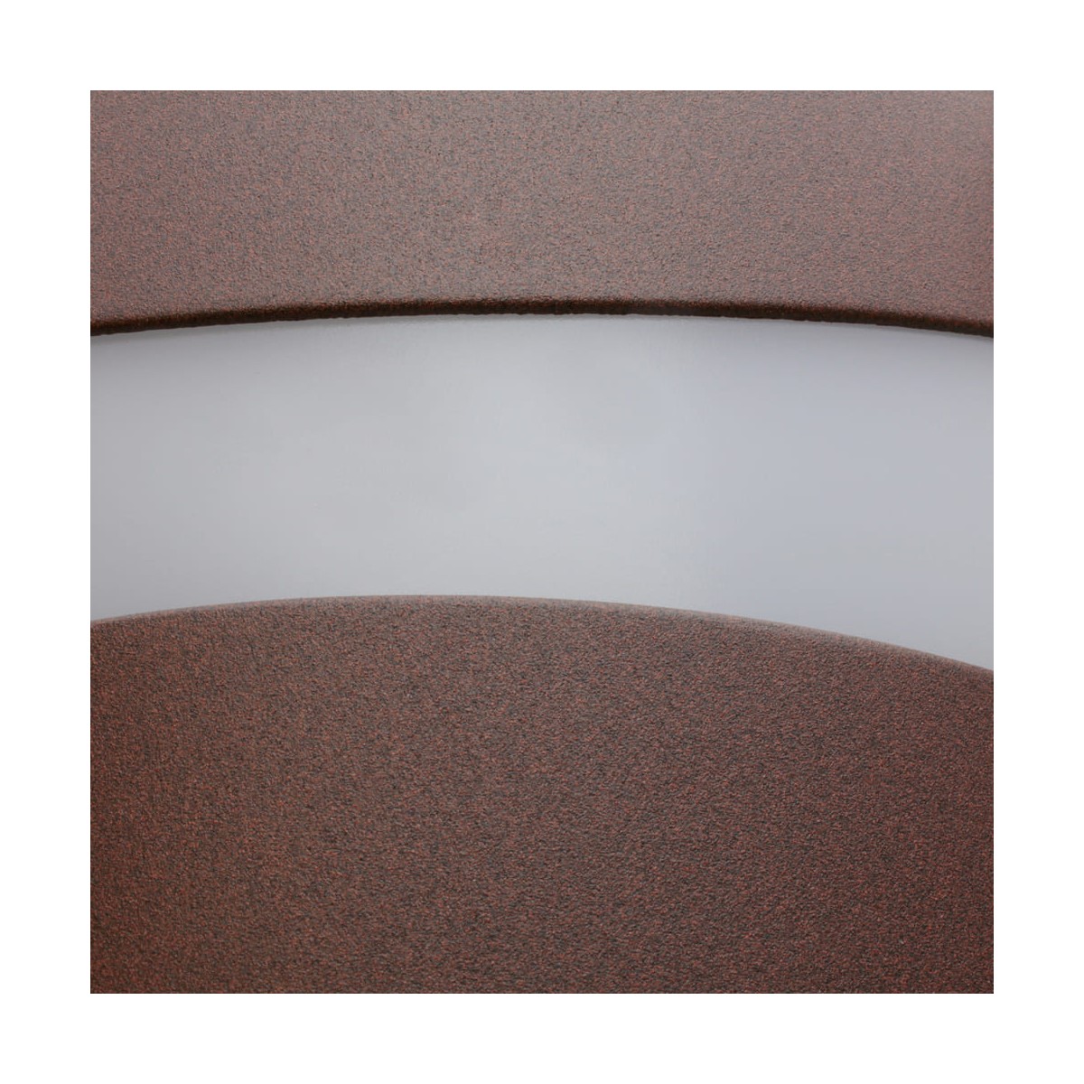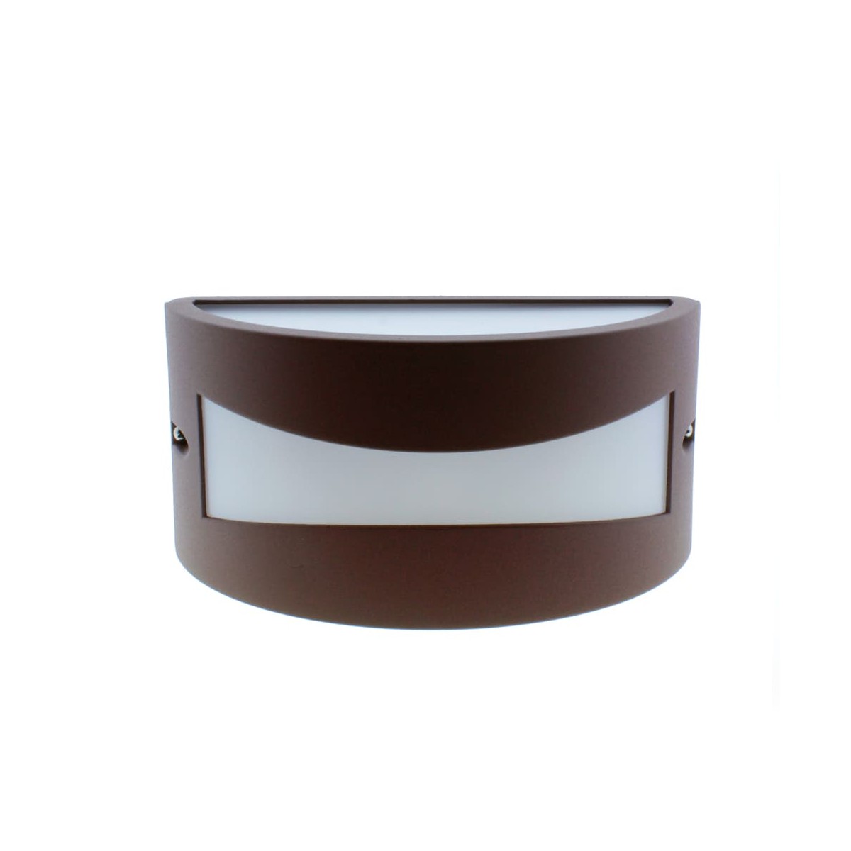 Wall light suitable for outdoor use with IP44. Rust brown lacquered aluminium structure. With opaque and translucent white diffuser. For E27 bulb, not included.