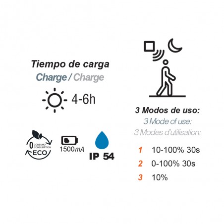 Tali outdoor wall light with solar panel. Thanks to its solar panel and rechargeable battery, you can use the wall light without the need for electricity consumption. It has integrated LED technology in a warm white tone, providing soft ambient lighting. On the front it has a movement/crepuscular sensor with three modes of use. IP54 rating.