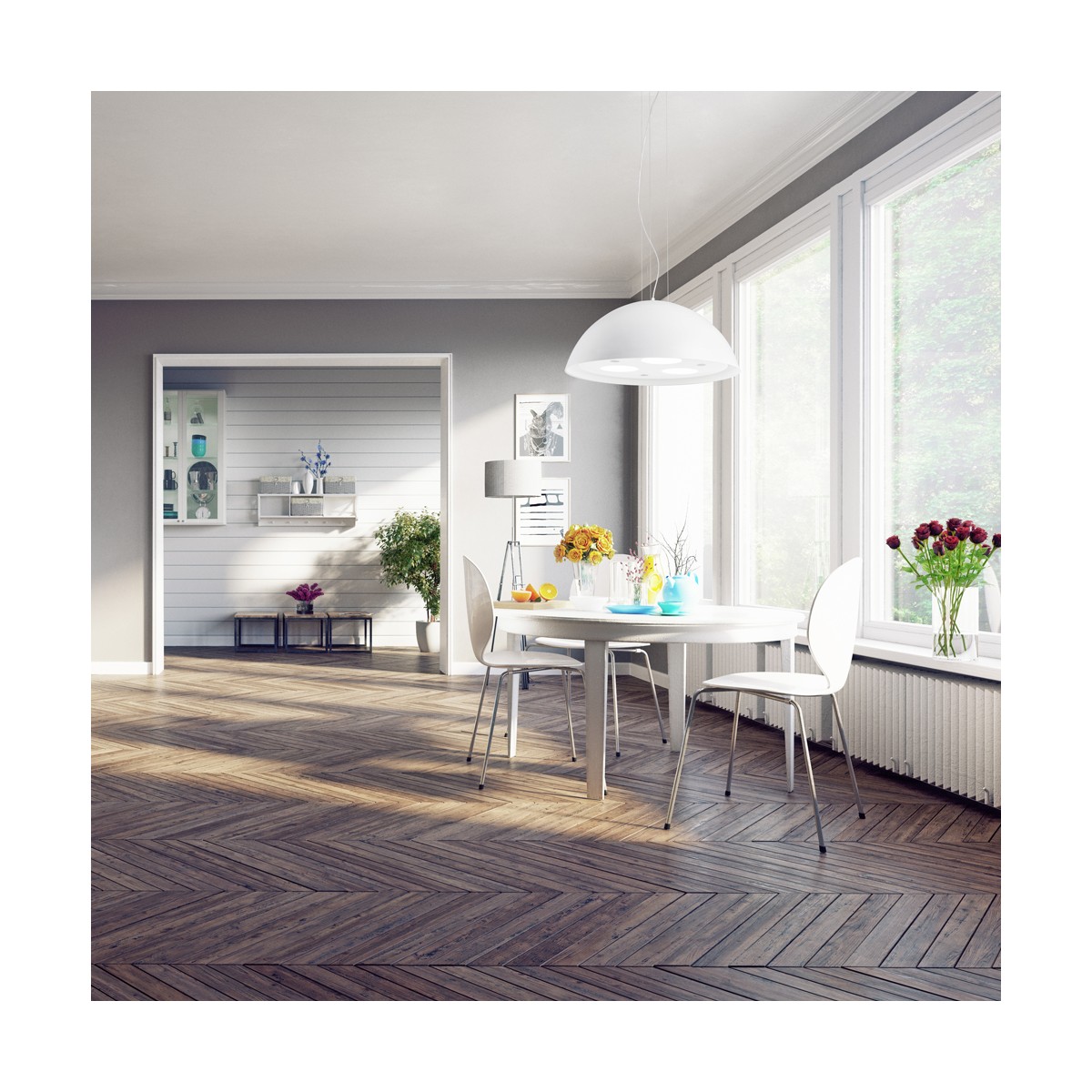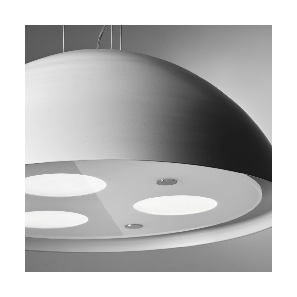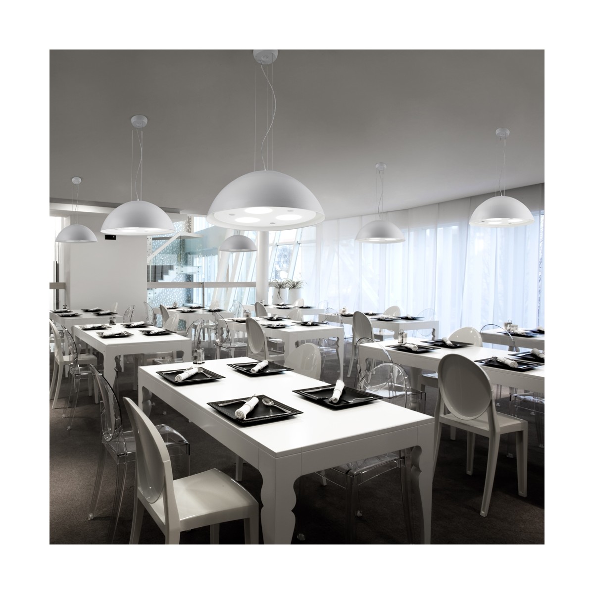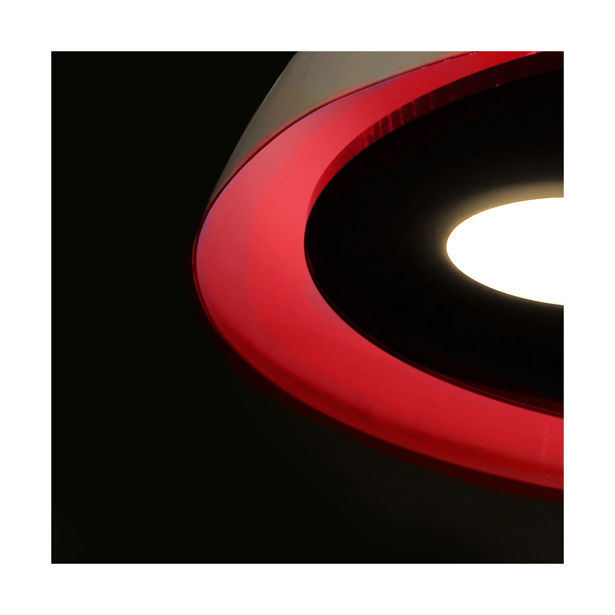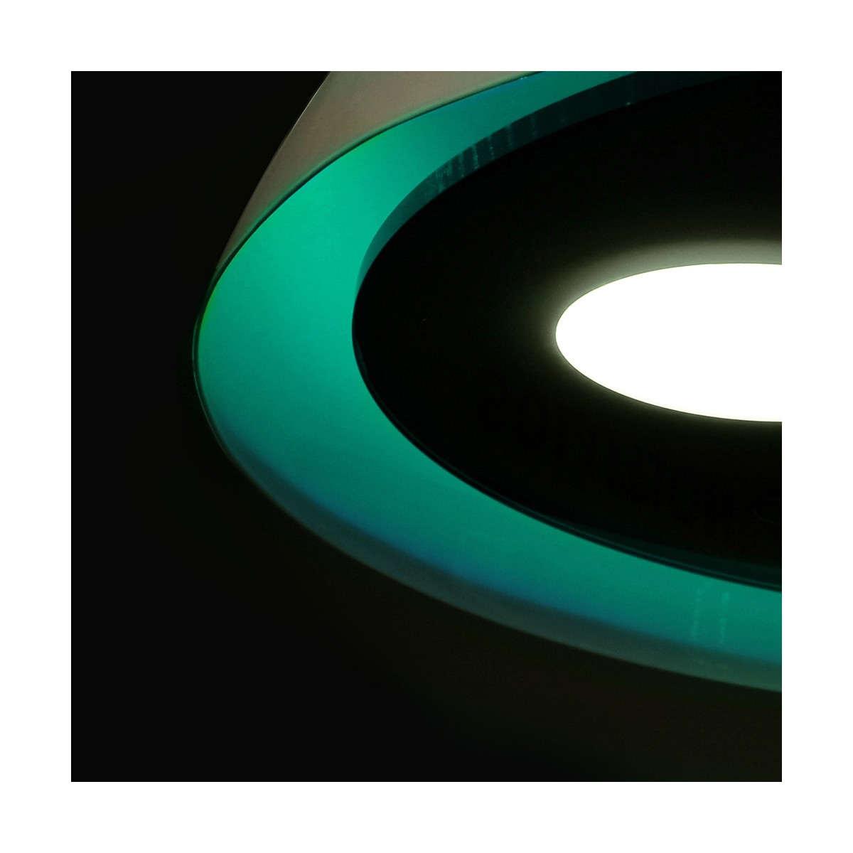 Aluminium shade coated in a high quality white paint for a striking appearance. Includes 36 watt triple LED light, to provide a very natural 4000K light that comes out through a white lampshade printed tempered glass. This model also offers an 18 watt RGB LED light to complete a colourful scattered ambient light. *Driver included.