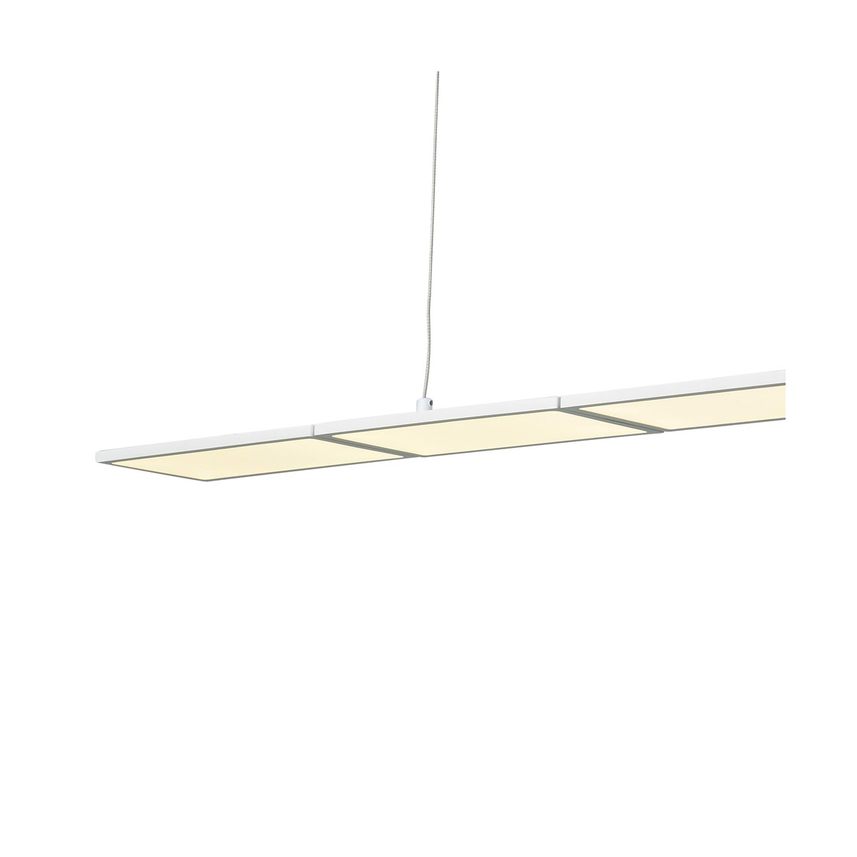 Pendant ceiling lamp with four integrated SMD LED lights. It has a power of 60W, 3600lm, warm light of 3000K, adjustable in intensity. The structure of the lamp is made of white lacquered aluminium.