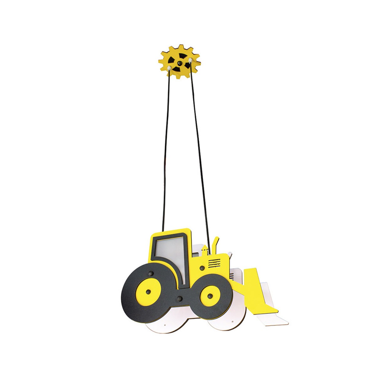 Yellow Tractor Pendant Light for kids kin in construction cars, and roads repair. The structure in the shape of an excavator, made of MDF, with a maximum drop of 80 cm, works with two light bulbs of E14, not included. Hanging Light perfect to decorate the room of your children.
