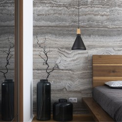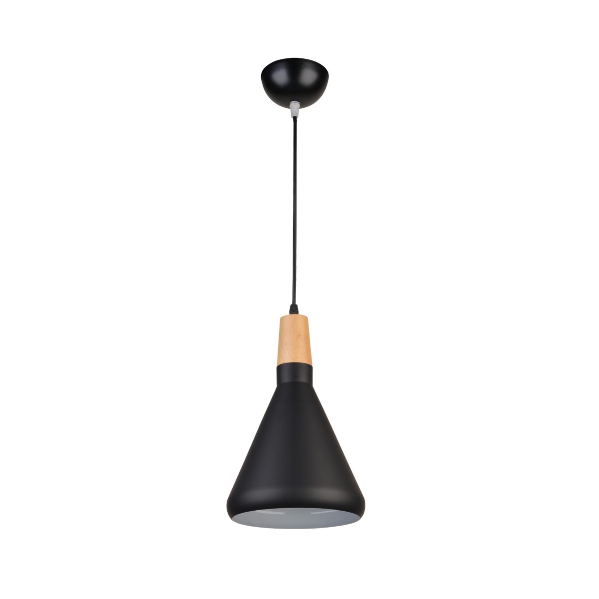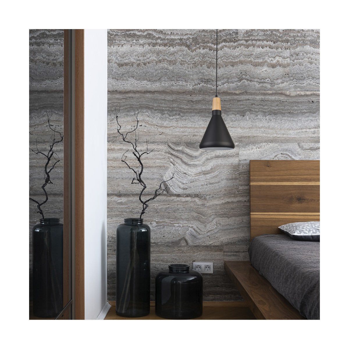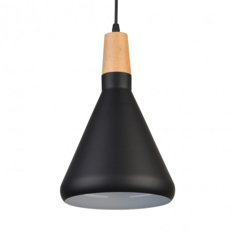 Scandinavian style pendant lamp. Ceiling lamp with black metal and wood inspired by the Scandinavian lighting style. This combination of materials and colours is ideal to give a Nordic touch to the lighting and decoration of a room. You can install a ceiling lamp on each side of the bed above the bedside table.