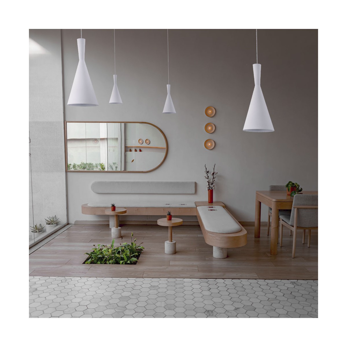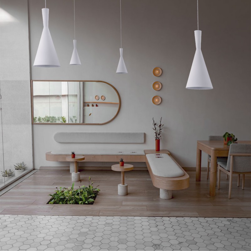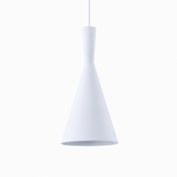 White conical pendant lamp for living rooms and bedrooms. Ceiling lamp with a minimalist design, perfect to install on the ceiling of living rooms and bedrooms as decorative lighting. Black metal lampshade in conical shape. Collection of ceiling lamps Dafne.