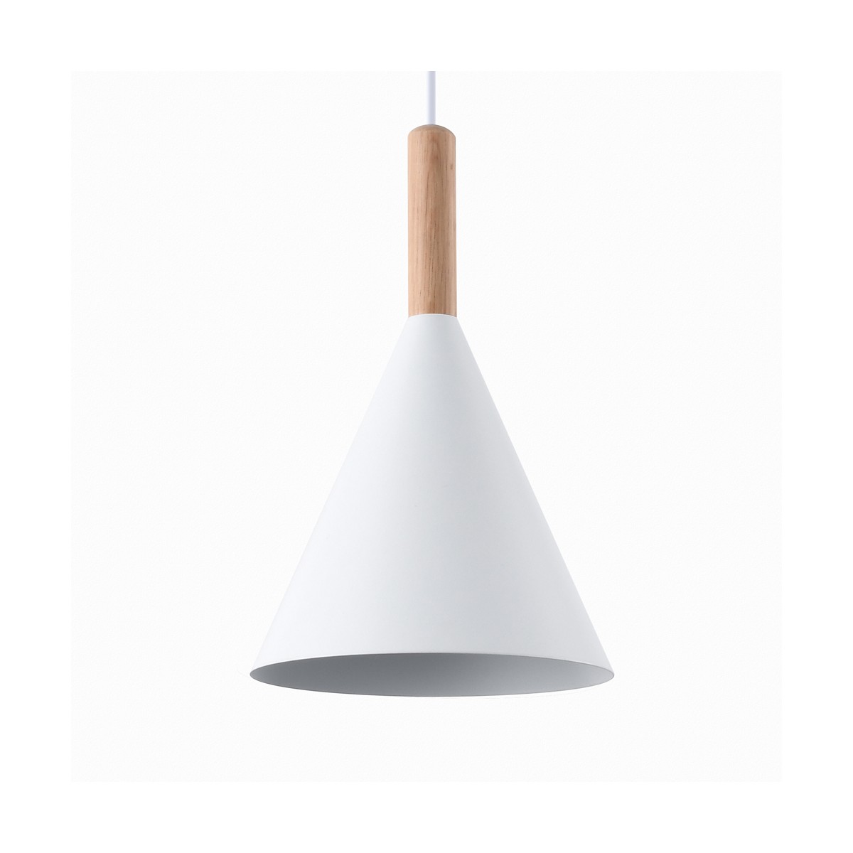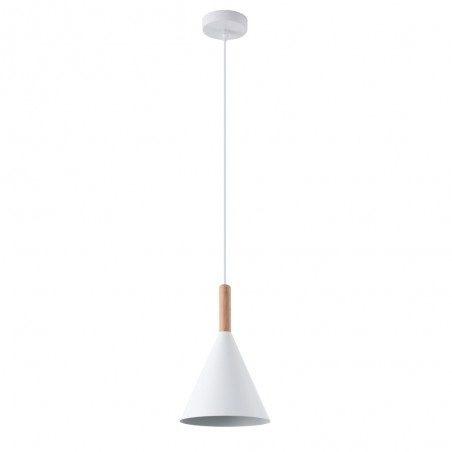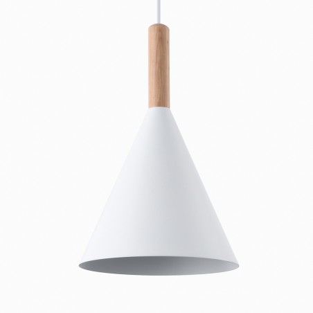Nordic style pendant lamp. Ceiling lamp in white with a decorative piece of wood on the lampshade. Conical shape with a diameter of 18 centimetres, perfect for providing light on a specific point in the room. You can install a pendant lamp on each side of the bed above the bedside table.