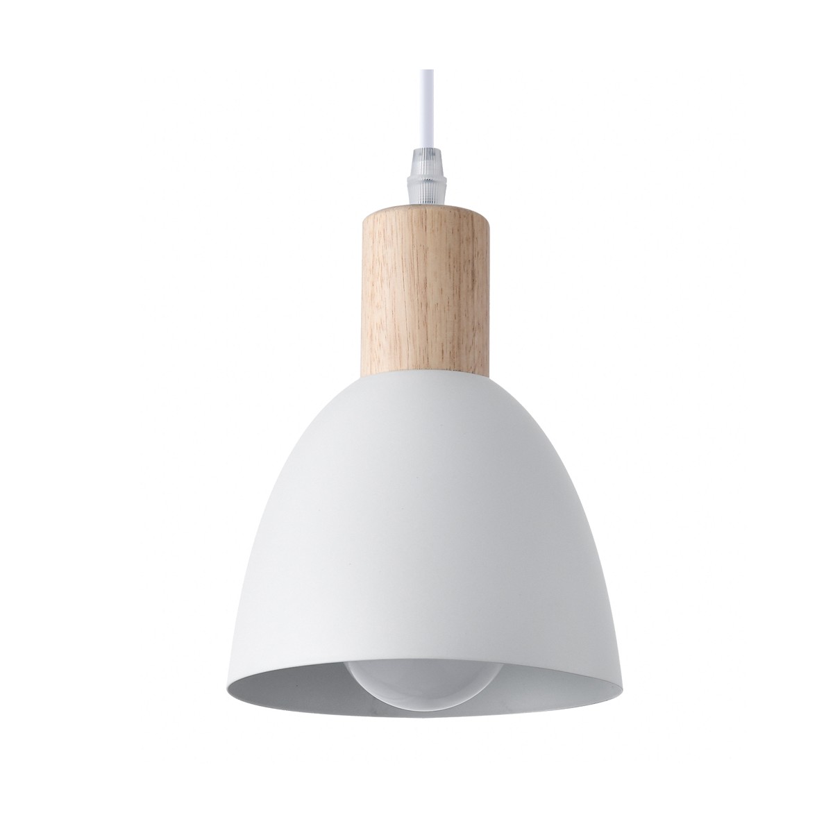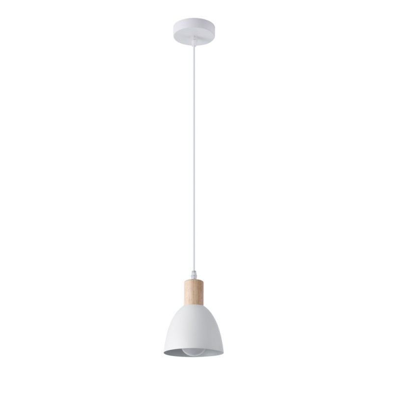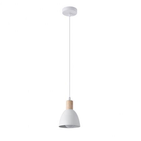Nordic style pendant lamp. Ceiling lamp in white with a decorative wooden piece on the shade. Its compact design of only 14 centimetres in diameter makes it an ideal solution for installing over the bedside table as lighting.