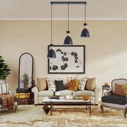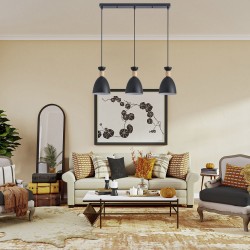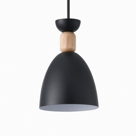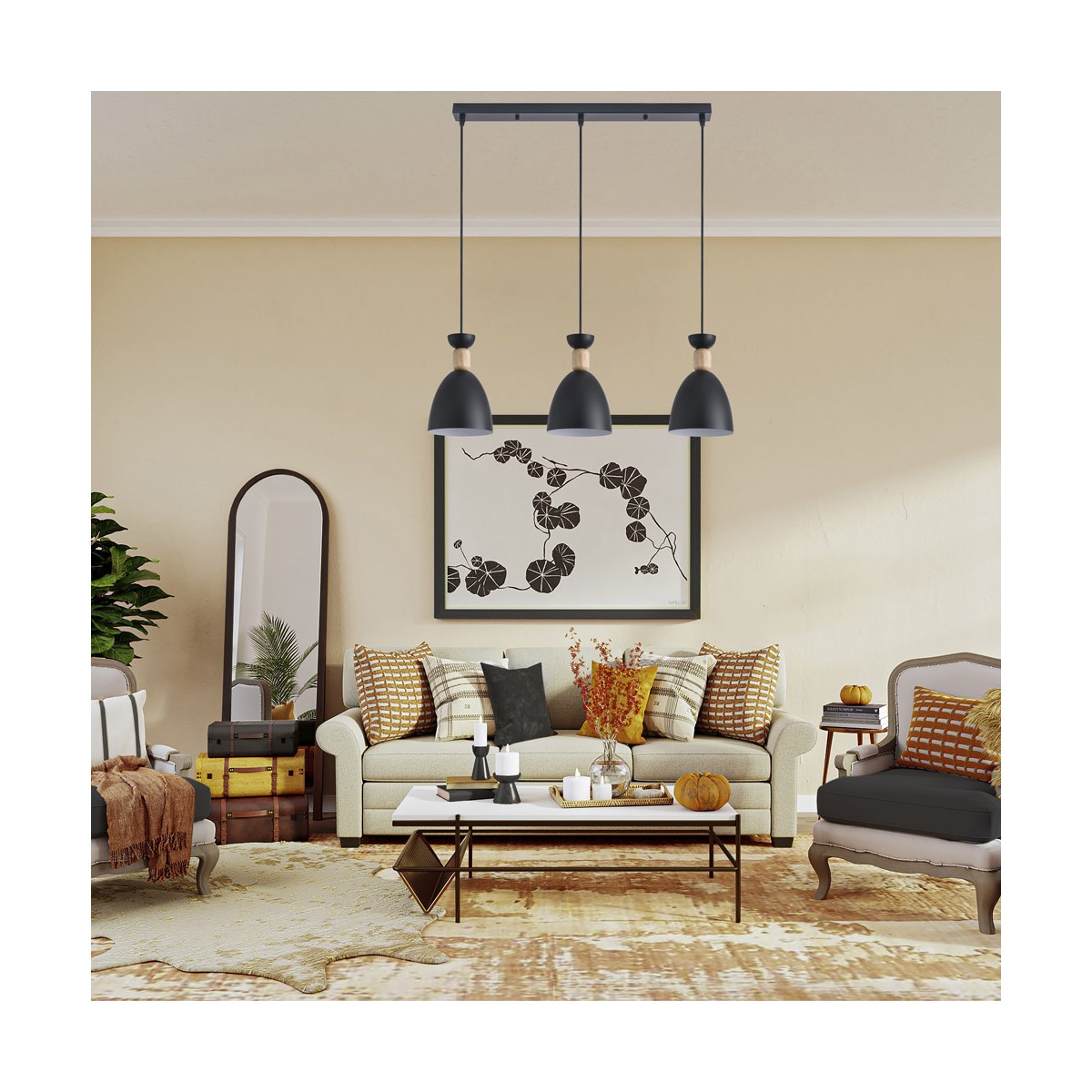 Pendant light for living rooms and kitchens. Cloe ceiling light with three shades, perfect for providing light on a worktop or a dining table. Each shade is made of black metal with a decorative piece of wood. Cloe decorative interior lighting collection.
