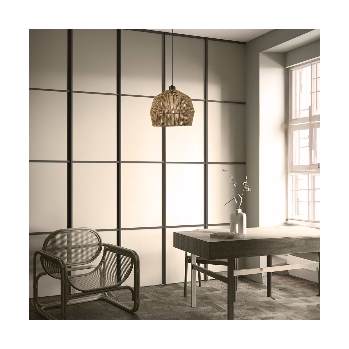 Krabi boho chic pendant lamp. Ceiling lamp with a rattan rope shade designed for decorative lighting in an indoor space. The light from the bulb creates a play of effects and shadows thanks to the ropes that make up the shade. Krabi natural style collection.