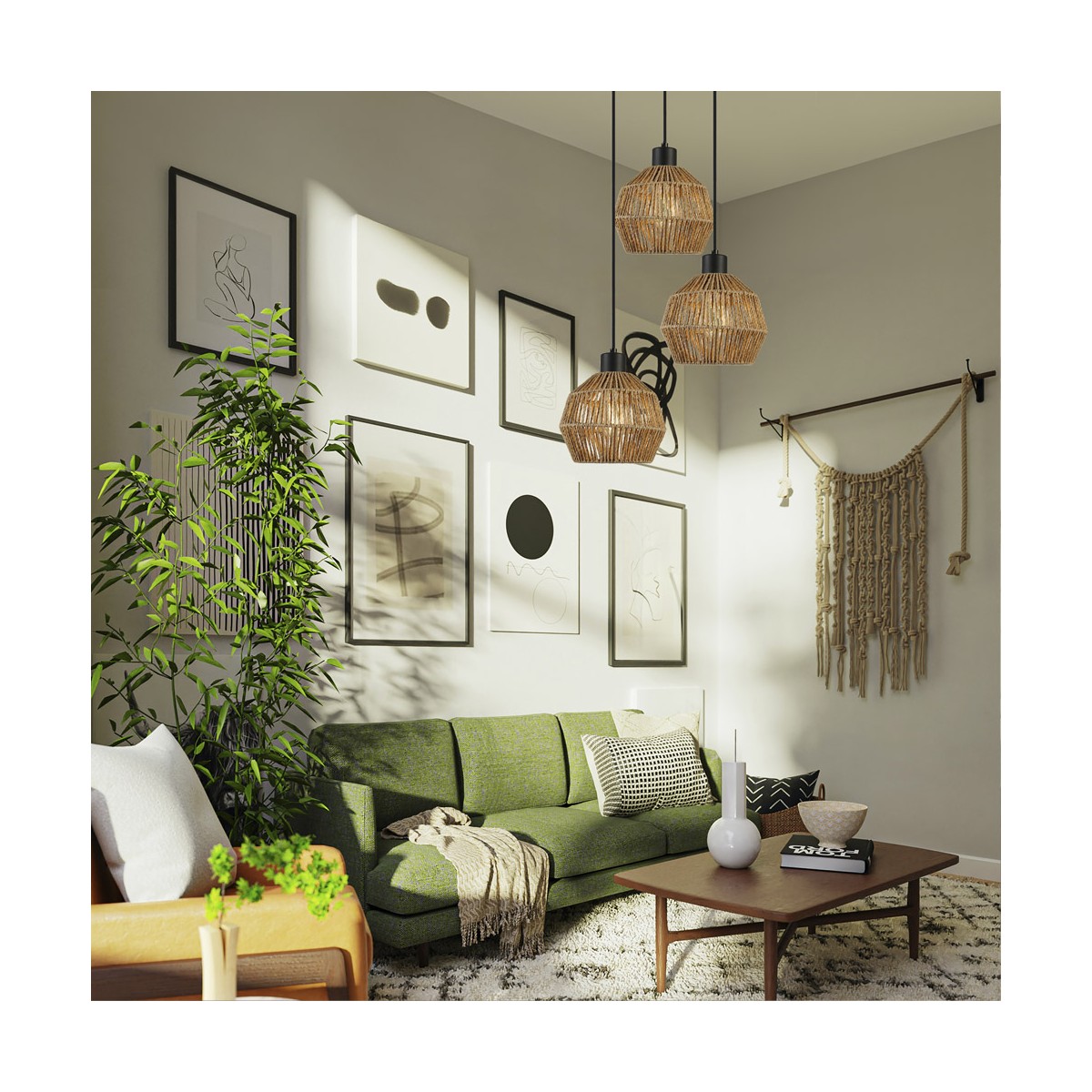 Krabi three-light boho chic pendant lamp. Ceiling lamp with rattan rope lampshades designed for the decorative lighting of an indoor space. The light from the bulb creates a play of effects and shadows thanks to the ropes that make up the lampshades. Krabi natural style collection.