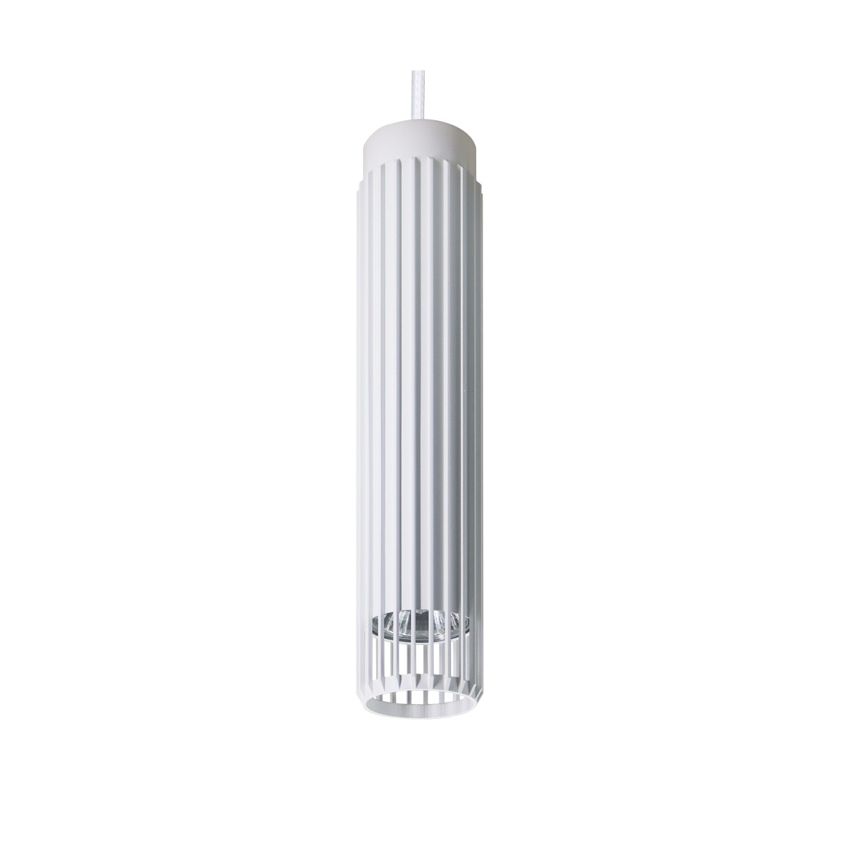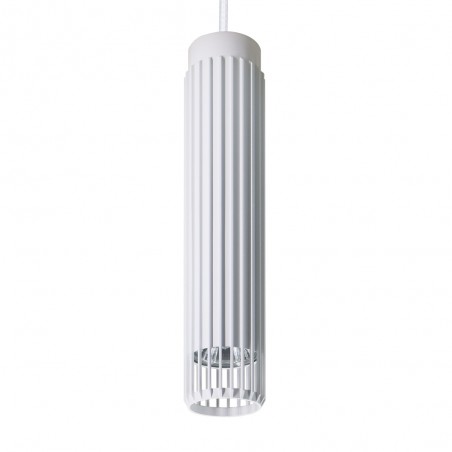 Sahara pendant lamp for indoor lighting. Cylindrical design in relief with grille bottom. Made of sandblasted white aluminium. Operates with a GU10 LED bulb Max. 10W (not included). Sahara decorative lighting collection.
