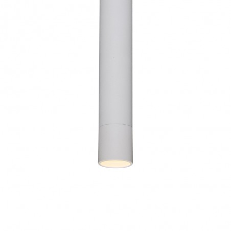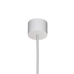 White tubular pendant lamp. Ceiling lamp with a focused point of light ideal for illuminating kitchen worktops, bar counters or dining tables. Made of white aluminium. White textile cable.