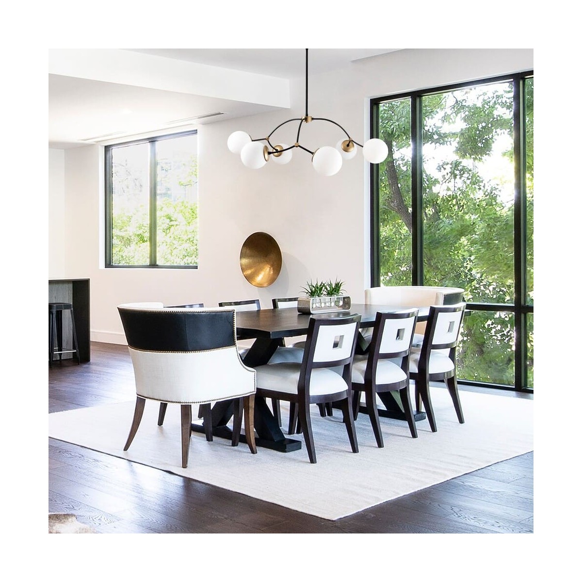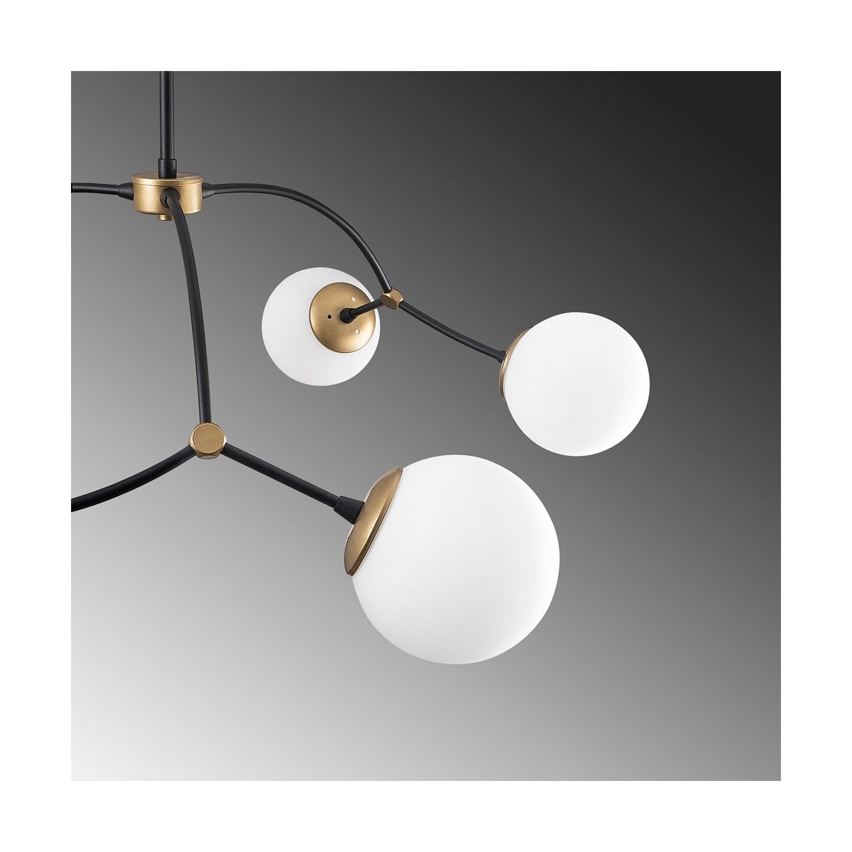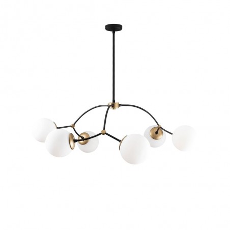 Decorative pendant ceiling lamp with black lacquered metal body with six lights and frosted white glass shades. This decorative chandelier lamp has a diameter of 90cm with a 10cm fleuron, easy to install. The height of the lamp is 69cm and is not adjustable. It works with E27 bulbs, not included.