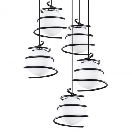 Decorative pendant ceiling lamp with five lights and frosted white glass lampshades. This lamp allows you to adjust the height of the lights from 36 to 116 cm high, customising the final design. It works with E27 bulbs, not included.