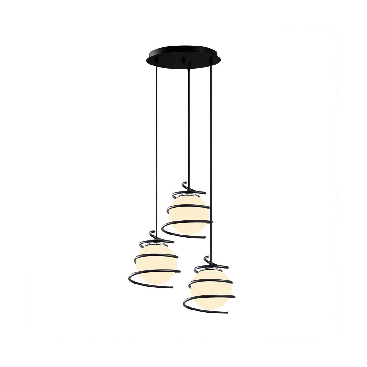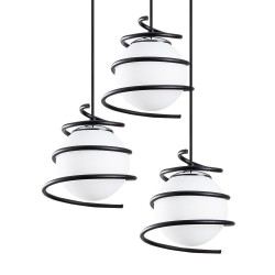 Decorative pendant ceiling lamp with three lights and frosted white glass lampshades. This lamp allows you to adjust the height of the lights from 36 to 116 cm high, customising the final design. It works with E27 bulbs, not included.