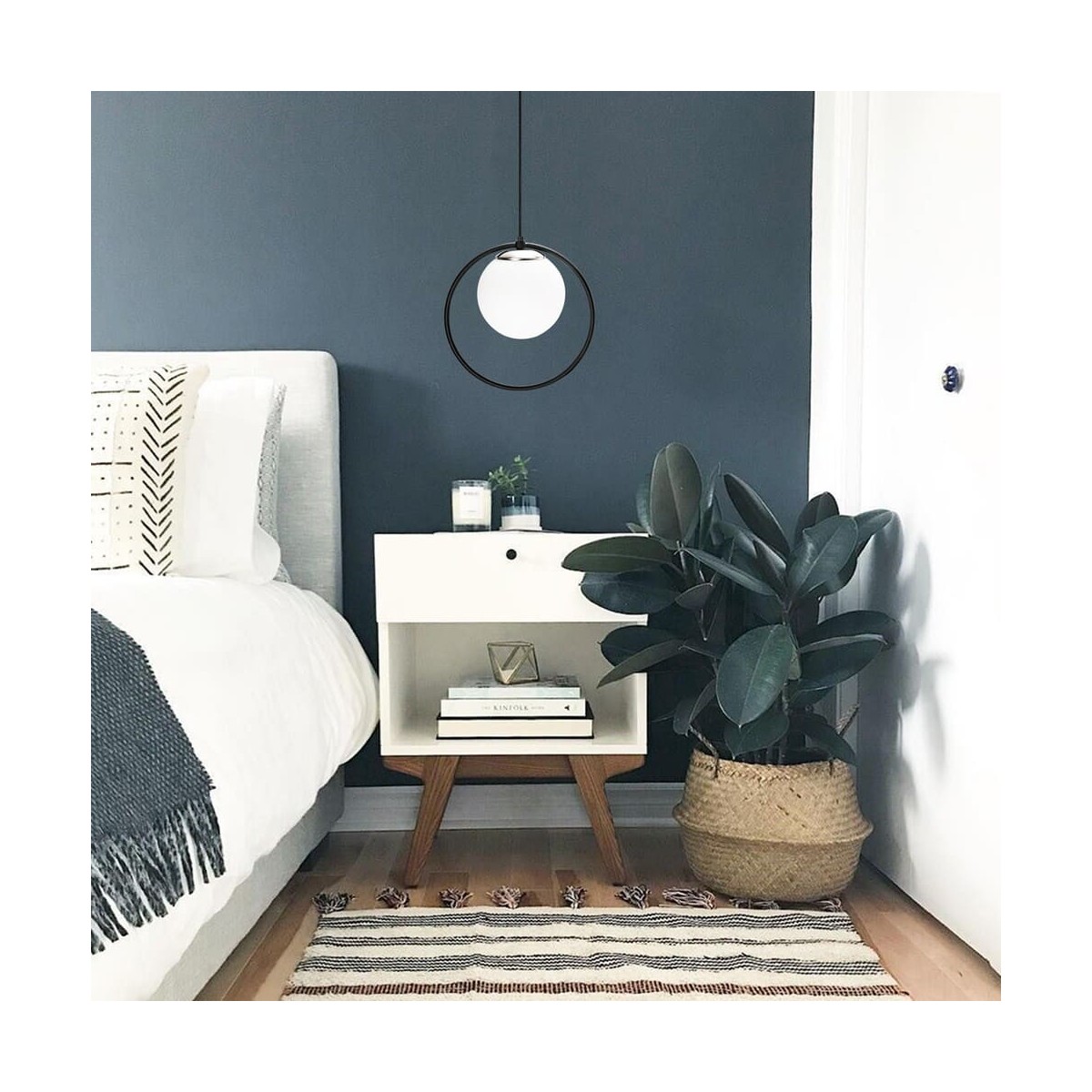 Decorative pendant ceiling lamp with adjustable cable lengthand displaced light point. Modern design consisting of a matt white glass shade surrounded by a black metal ring. It allows to create different decorative lighting compositions, adapting to different spaces, by adjusting the height of the lamp. Perfect for dining rooms, living rooms and bedrooms looking for a different style of lighting. For E27 bulbs, not included.