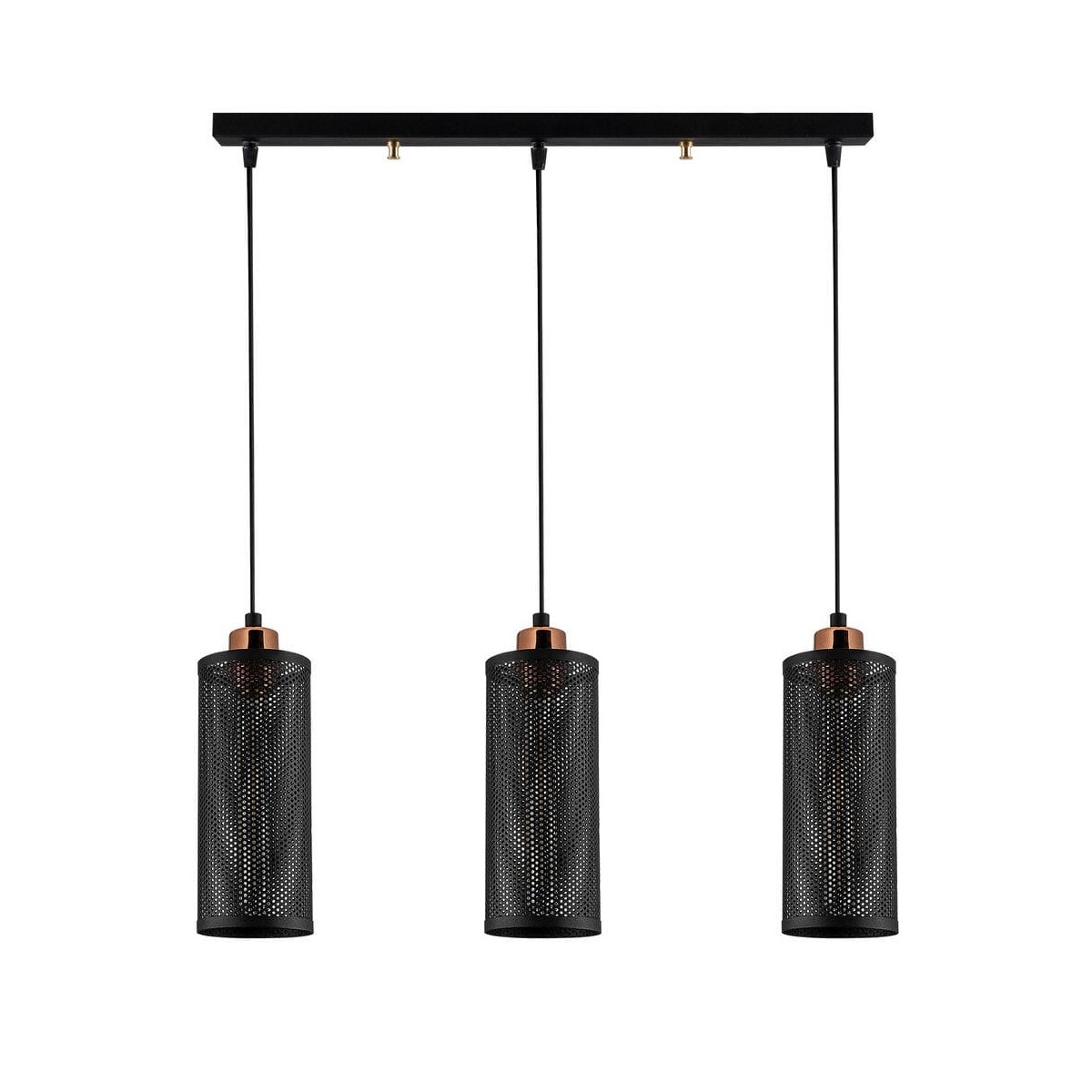 Decorative ceiling lamp with rectangular shaped ceiling canopy and three industrial style pendant lights that can be adjusted in height. The metal shade of each of the bulbs imitates a cage. The cable length is 90 cm and can be adjusted to a minimum height of 2 cm. For E27 bulbs, not included.