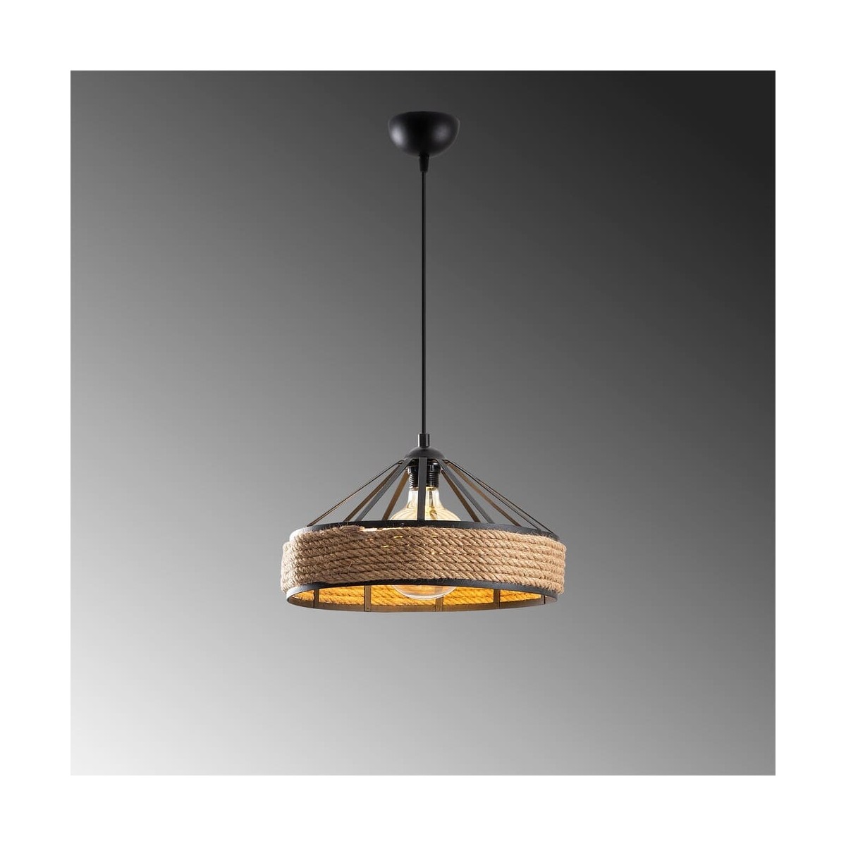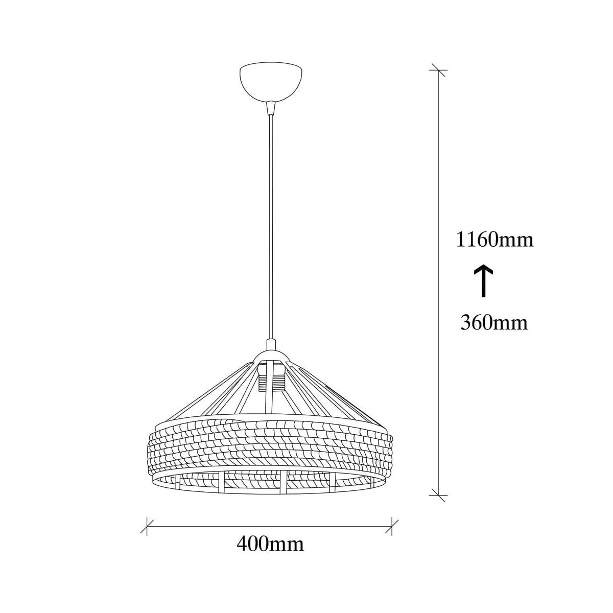Ceiling pendant lamp with 40 cm round lampshade. Black lacquered metal structure with natural rope style lampshade and adjustable cable length up to 90cm. It allows to create different decorative lighting compositions, in rustic style dining rooms, living rooms and bedrooms. For E27 bulbs, not included.
