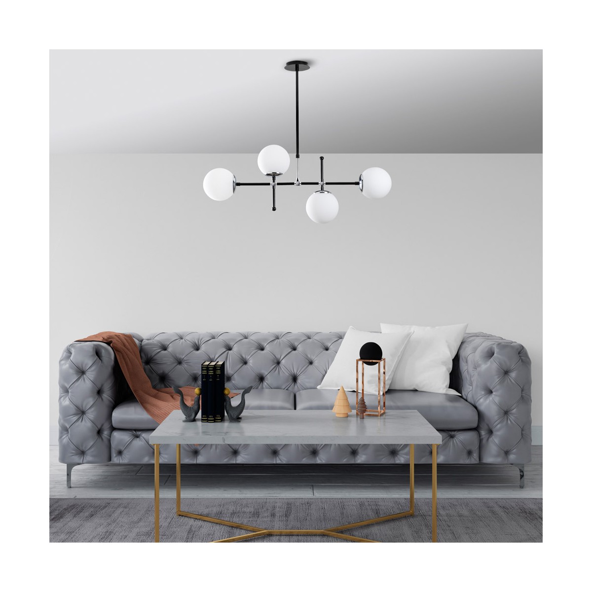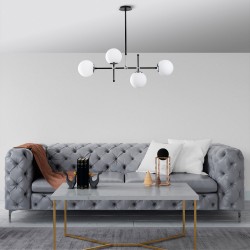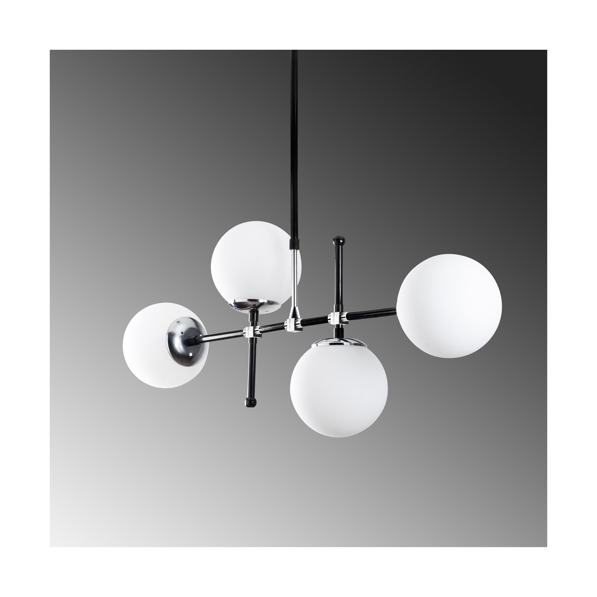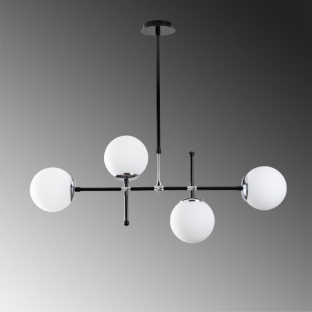 Pendant ceiling lamp made of metal with black finish and telescopic rod. Four lights with opal white glass lampshades. This decorative lamp is 98cm long and can be adjusted in height from 63 to 80cm. It works with E27 bulbs, not included.