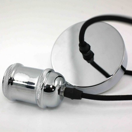 Pendant lamp holder designed in a polished chrome finish with round black fabric cable and solid metal ceiling rose. This type of lamp is a simple way to light any room adding something attractive to the decoration. It can be adjusted to different height levels. It can make a perfect match with a decorative filament LED bulb if you are looking for a stylish look. *Bulb not included.