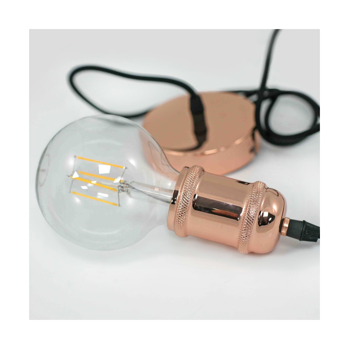 Pendant lamp holder designed in a polished copper finish with round black fabric cable and solid metal ceiling rose. This type of lamp is a simple way to light any room adding something attractive to the decoration. It can be adjusted to different height levels. It can make a perfect match with a decorative filament LED bulb if you are looking for a stylish look. *Bulb not included.