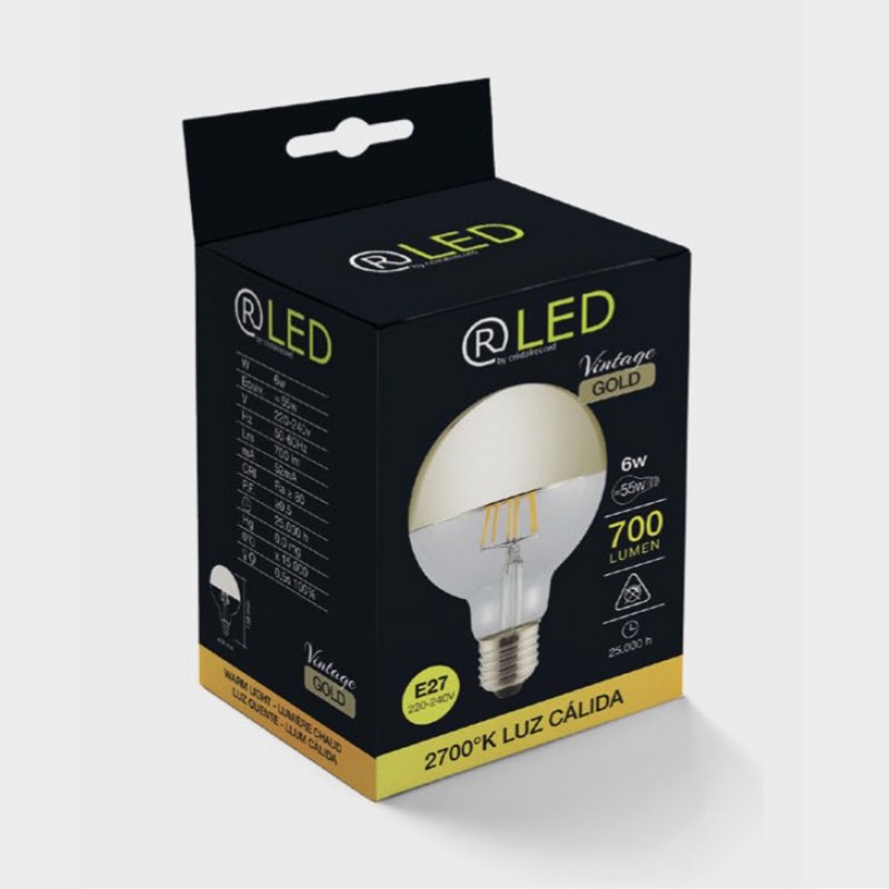 Half mirror collection LED bulb with 95 mm of diameter and gold colour metallic crown. It uses 6 watts to provide 700 lumens of warm light 2700K, and thanks to the edge it will reflect the light back onto the wall. With a vintage look, this type of bulbs can easily stand alone as prominent piece of home décor.