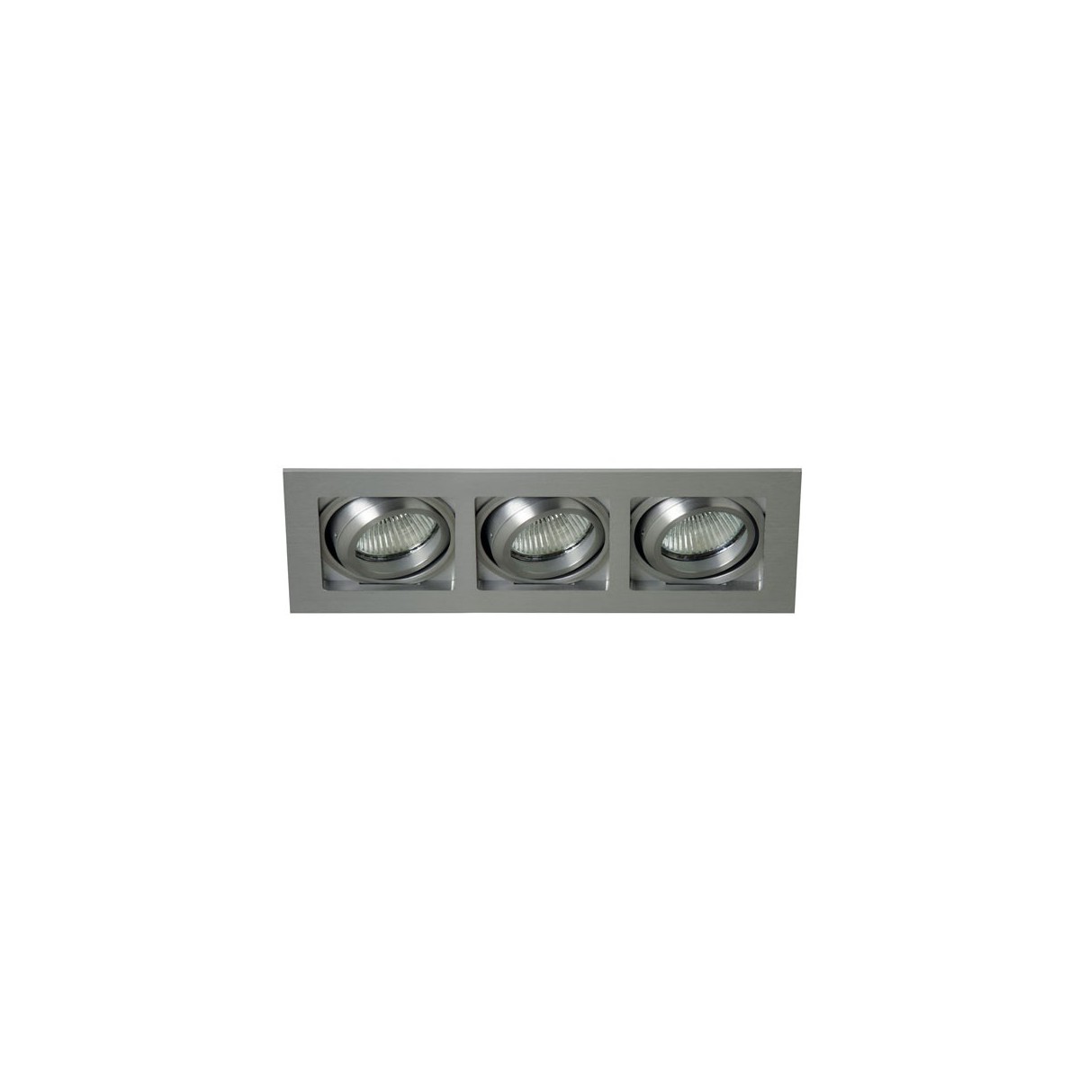 Recessed rectangular halogen with three tilting lights. Aluminium structure with silver finish. Includes 12V lamp holder. GU5.3 bulb 50mm plus 50W.