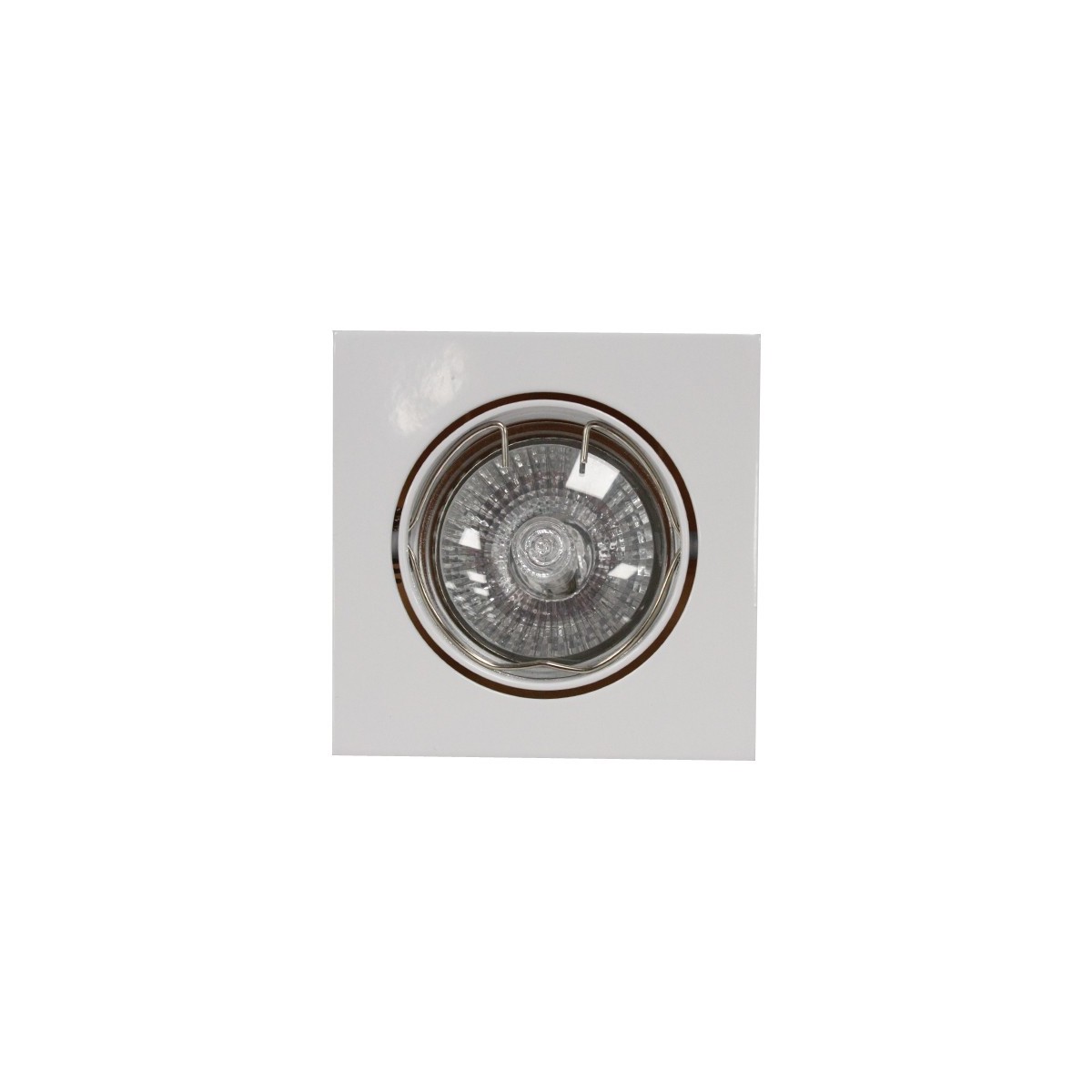80x80x20mm square tilting flush mount with aluminium structure and white finish. It has a 35° tilting angle. The circular thread measures 75mm in diameter. Protection class II. Includes one 50W, 27000°K, 270Lm, 230V GU10 halogen bulb. It is directly connected to the mains.
