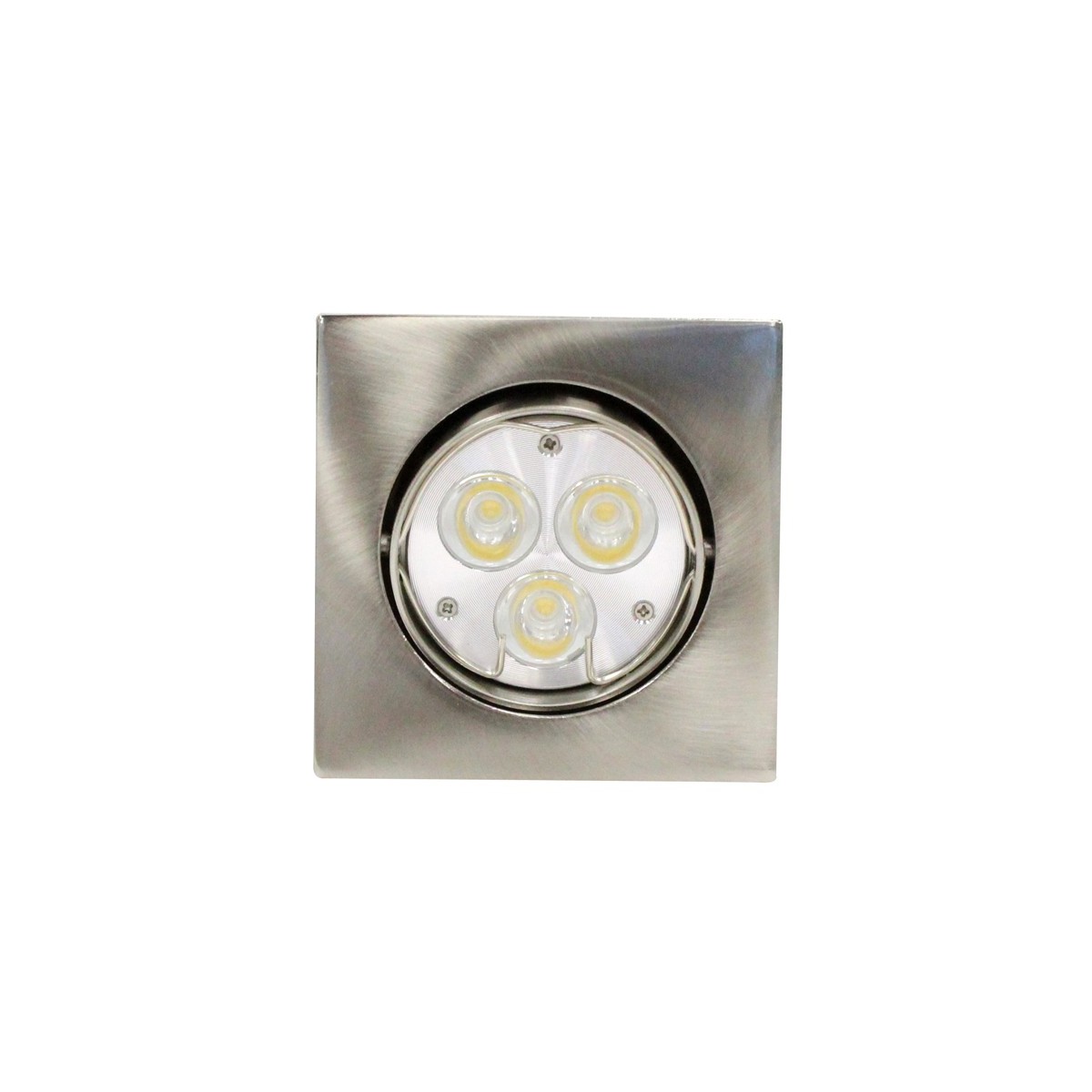 80x80x20mm square tilting flush mount with aluminium structure and nickel finish. It has a 35° tilting angle. The circular thread measures 75mm in diameter. Protection class II. Includes one LED GU10 bulb of 6W (=50W halogen), 3000°K of 230V and 50Hz. It is directly connected to the mains.