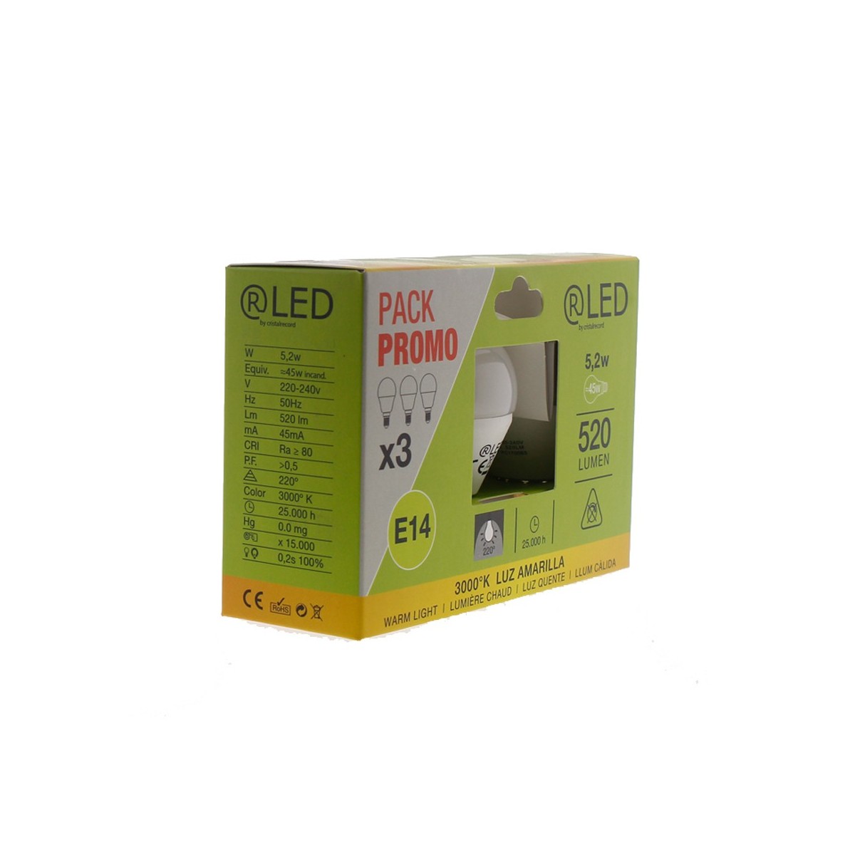 Pack of three 5.2W LED bulbs with E14 thread, 3000K warm light, 520lm.
