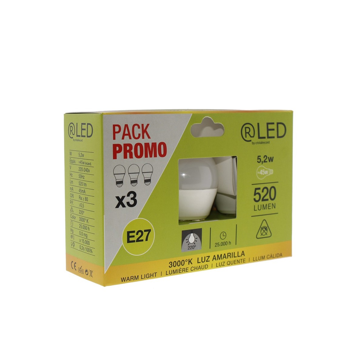 Pack of three 5.2W LED bulbs with E27 thread, 3000K warm light, 520lm.