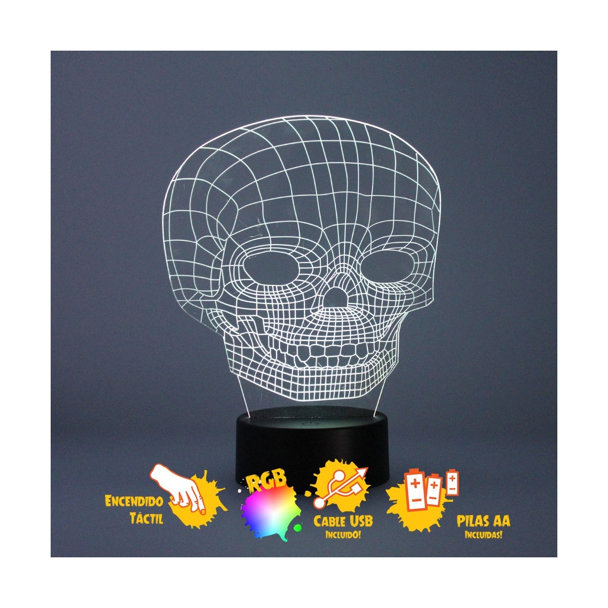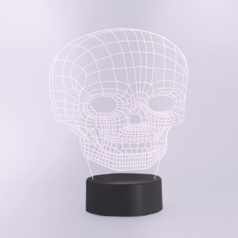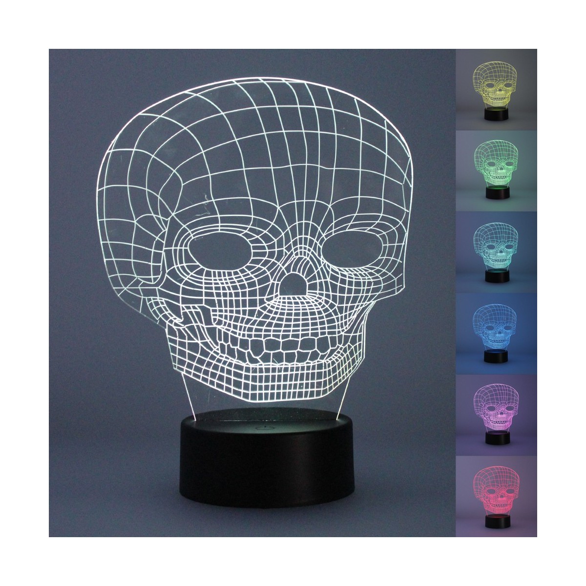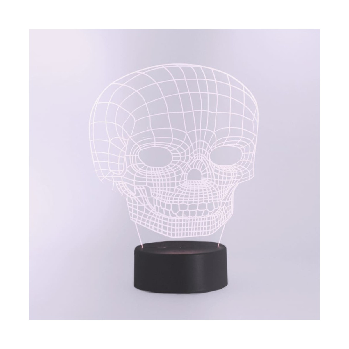 Happy Skull Table Lamp with 3D effect. LED RGB 2.5W lighting in 7 colours that can be left fixed in one colour or with a colour sequence. Great acquisition for decorating your reception desk or stores show window this Halloween. Works with USB cable or three batteries AA included.