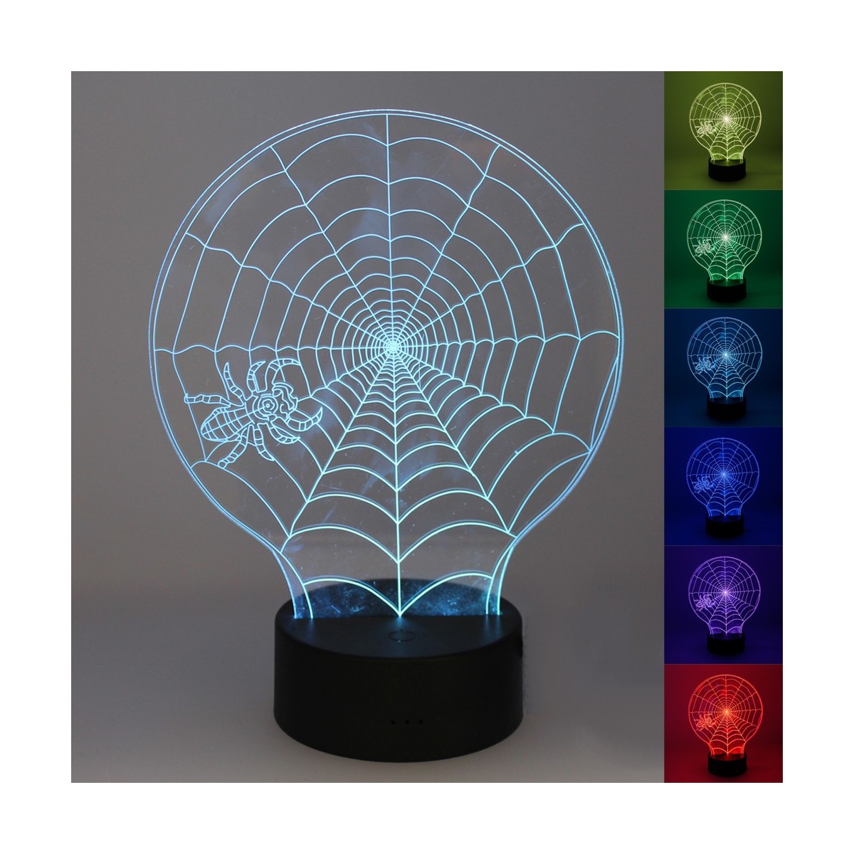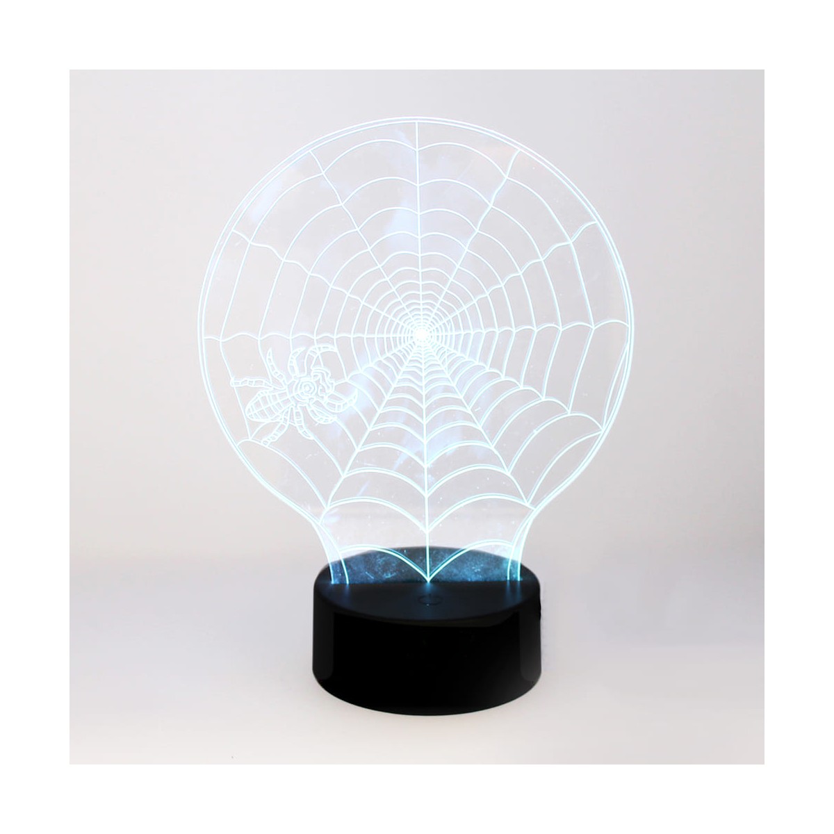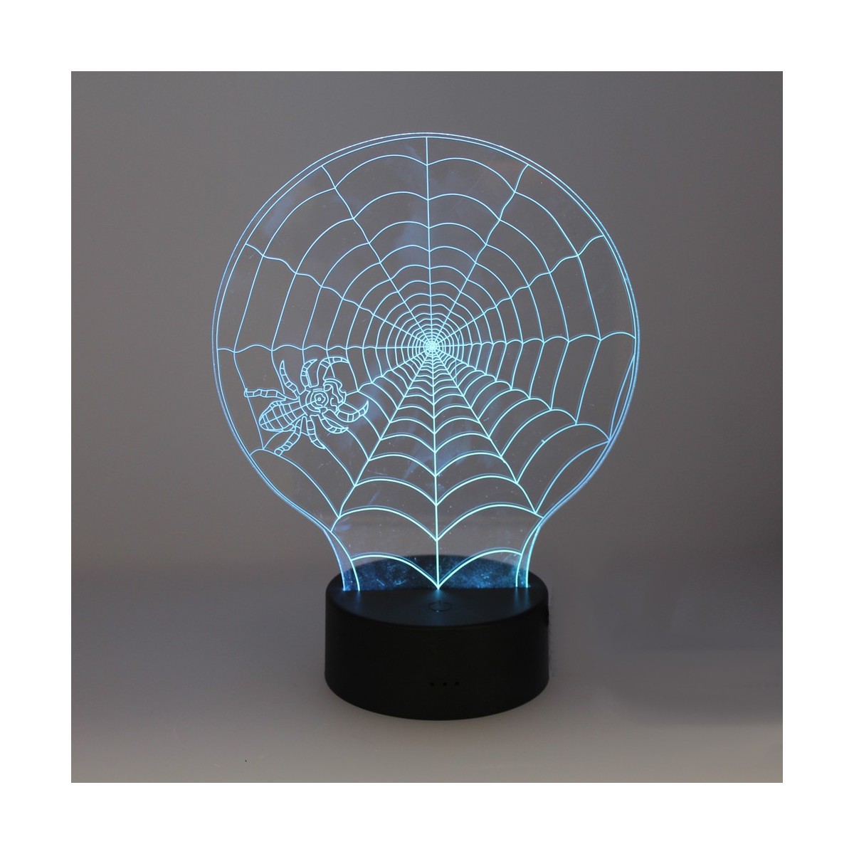 Table lamp Spider with 3D effect for Halloween. LED RGB 2.5W lighting with 7 colours that can be left fixed in one colour or with a colour sequence. It works with three batteries included or with a USB charger.