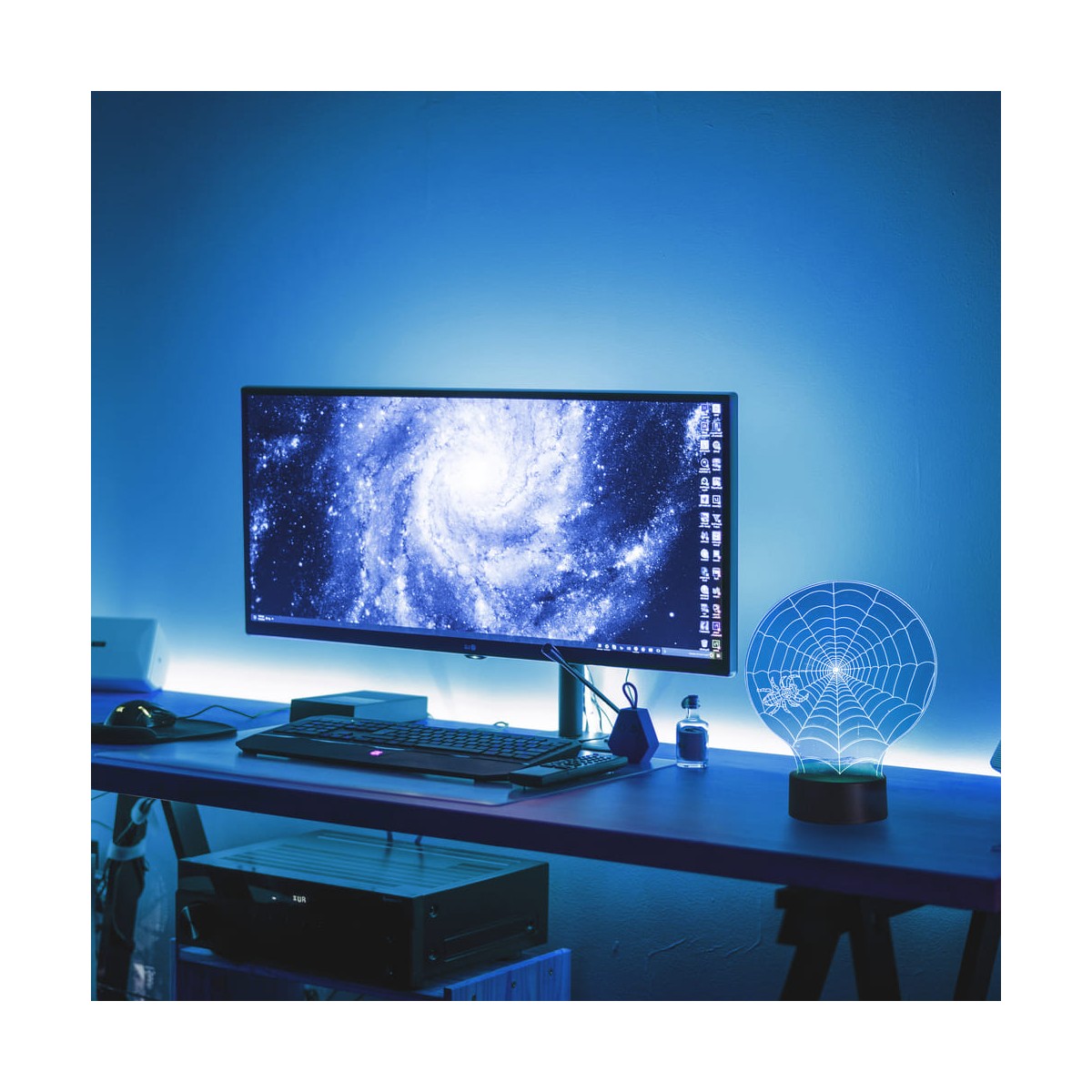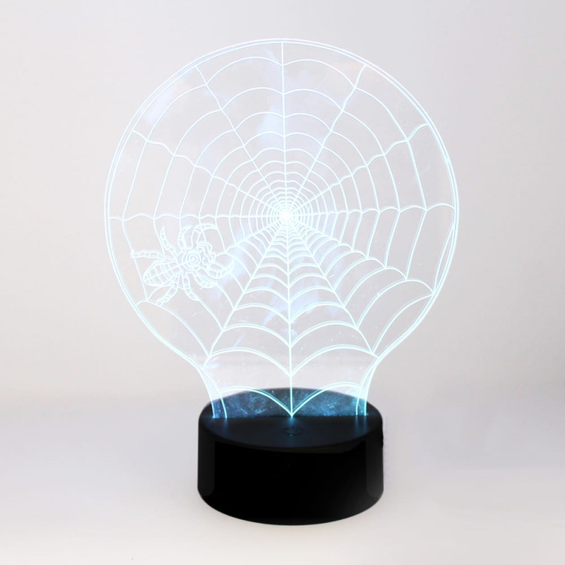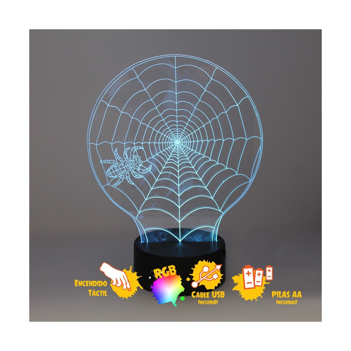 Table lamp Spider with 3D effect for Halloween. LED RGB 2.5W lighting with 7 colours that can be left fixed in one colour or with a colour sequence. It works with three batteries included or with a USB charger.