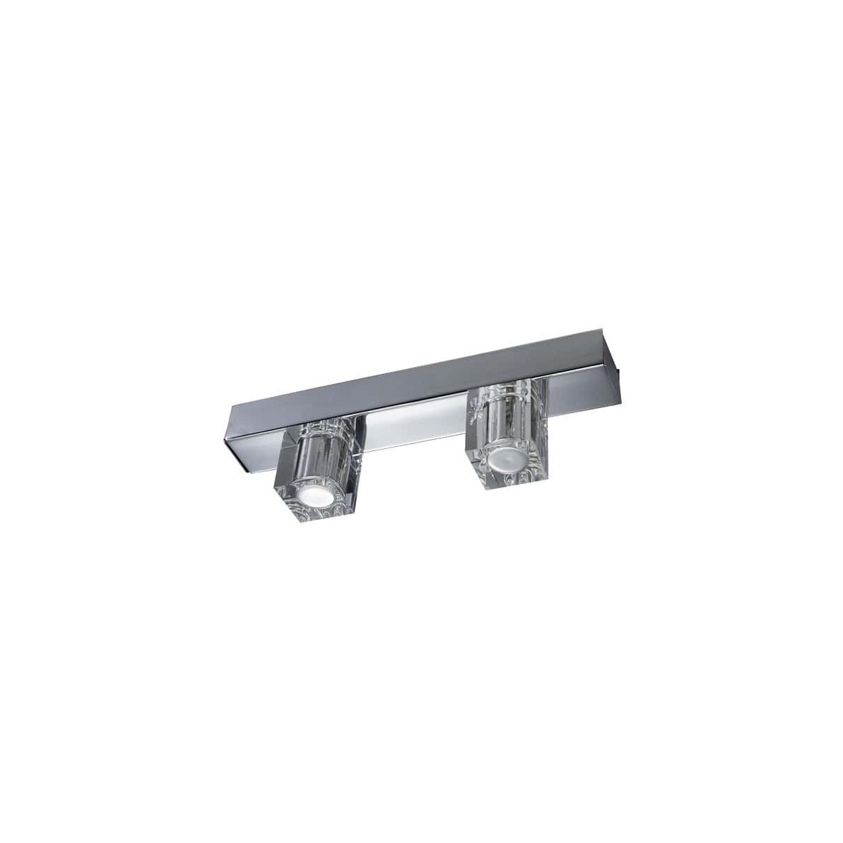 HYDROS track kit with two fixed lights. 60 x 300 x 105 mm rectangular metal structure with chrome finish. Transparent optic glass lampshades. G9 bulbs of 40W 220-240V.
