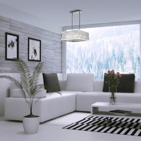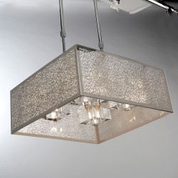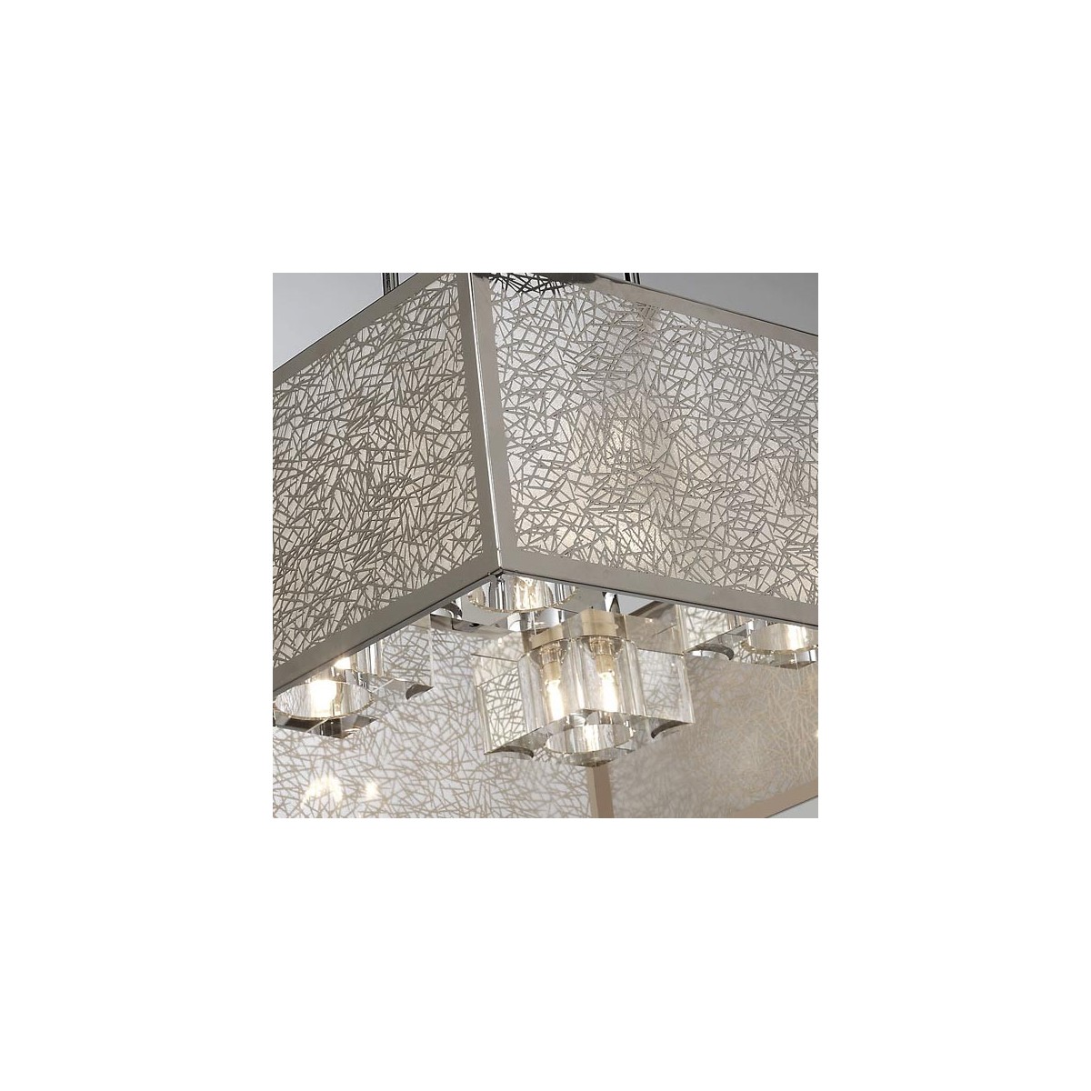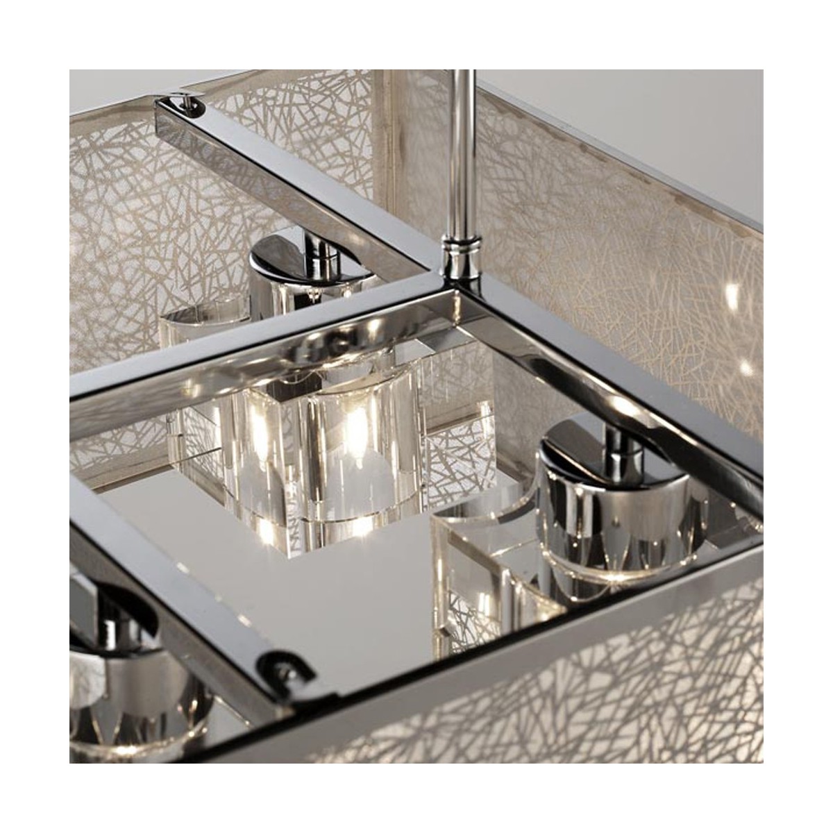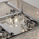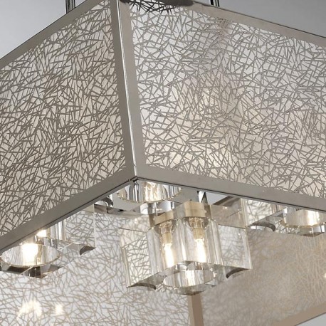 Contemporary pendant light made of steel and PVC. With a square shape and a polished chrome finish, this lamp includes 4 lights protected with glass lampshades and the height can easily be adjusted. *4xG9 included.