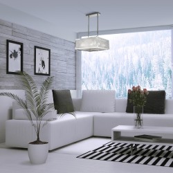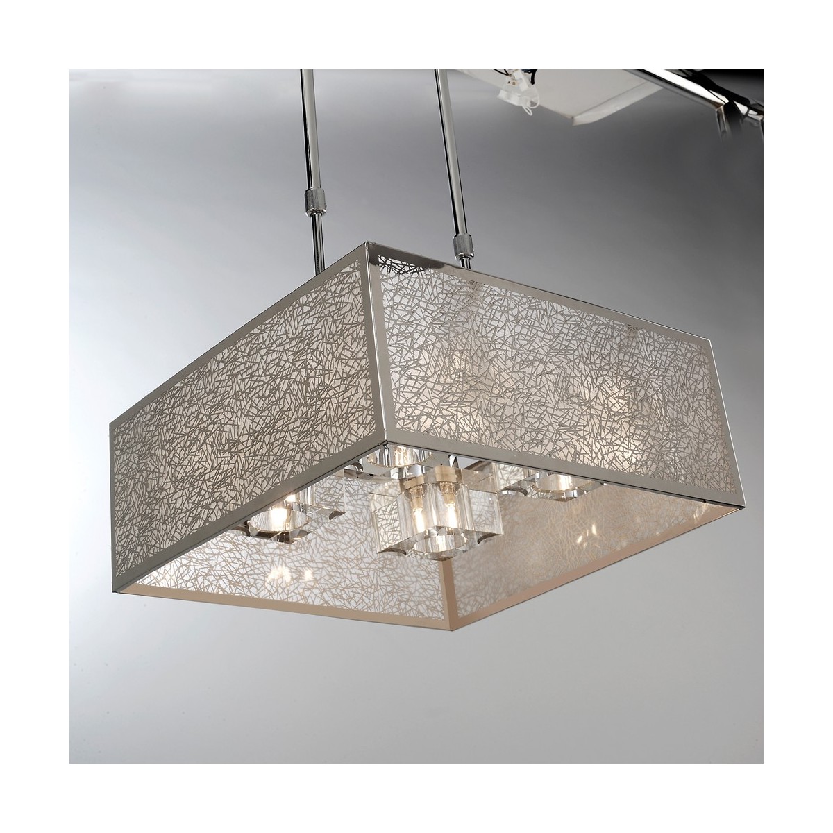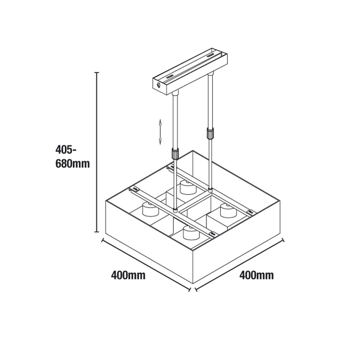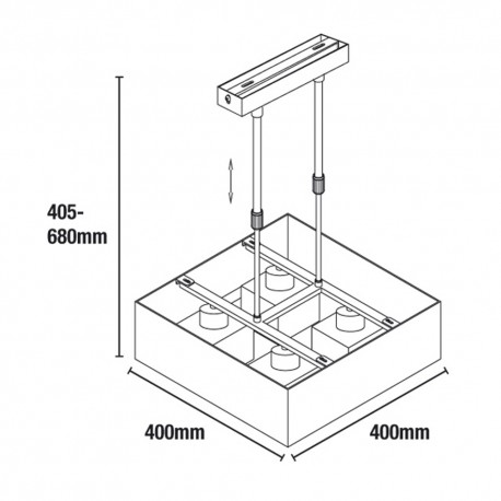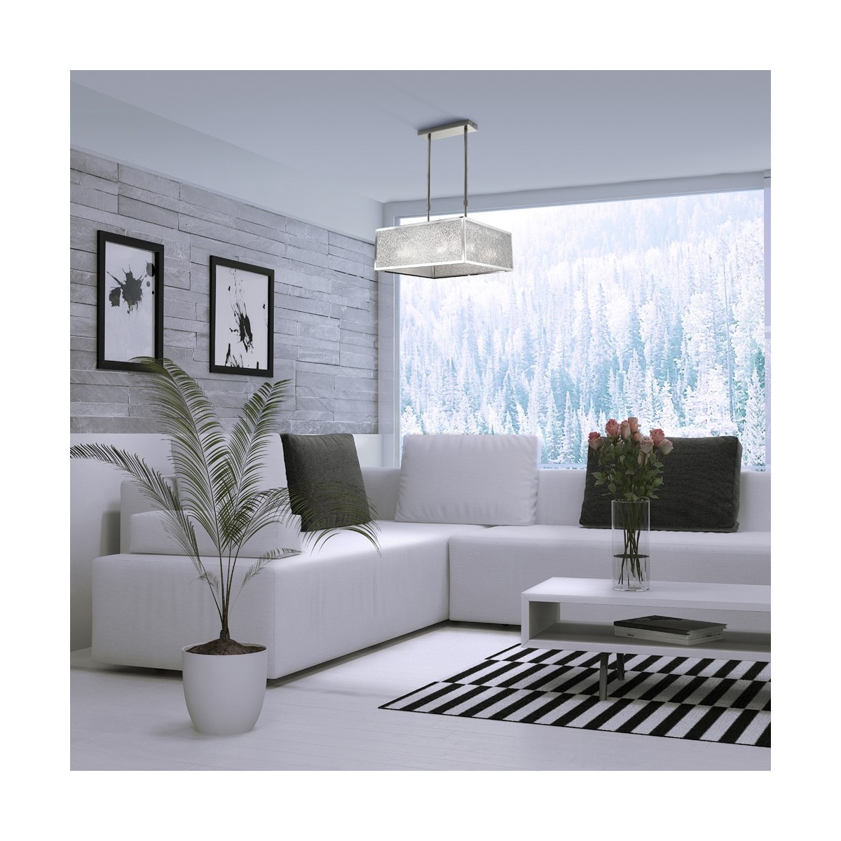 Contemporary pendant light made of steel and PVC. With a square shape and a polished chrome finish, this lamp includes 4 lights protected with glass lampshades and the height can easily be adjusted. *4xG9 included.