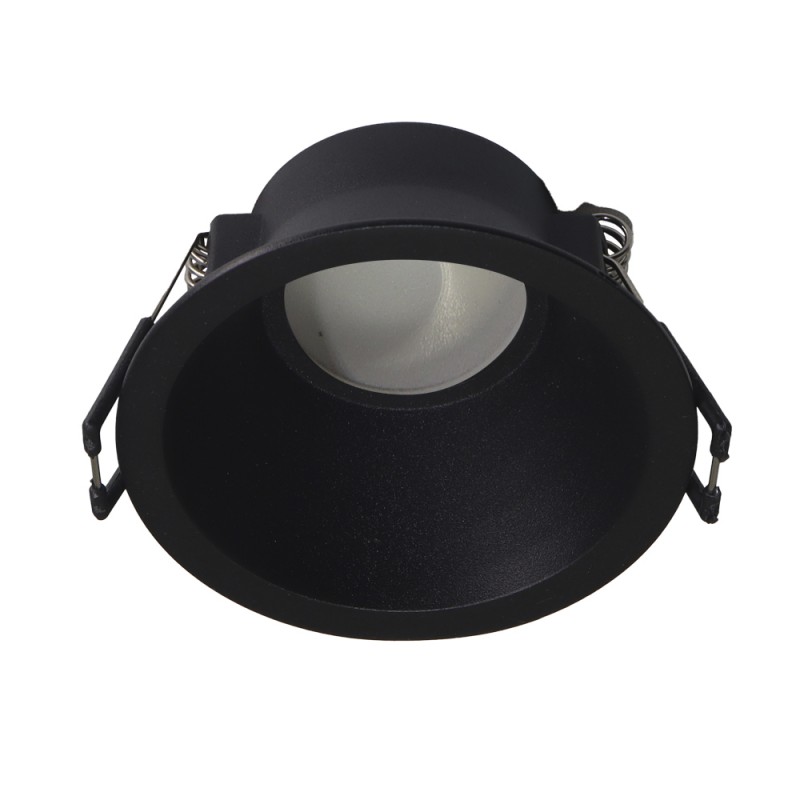 Round black recessed ceiling light. Fixed recessed downlight for functional indoor lighting. Circular design made of black textured aluminium. Recessed installation in the ceiling in a 6-centimetre gap. Ideal for contract lighting projects in homes, shops, hotels and businesses. Includes lamp holder for GU10 PAR11 bulbs.