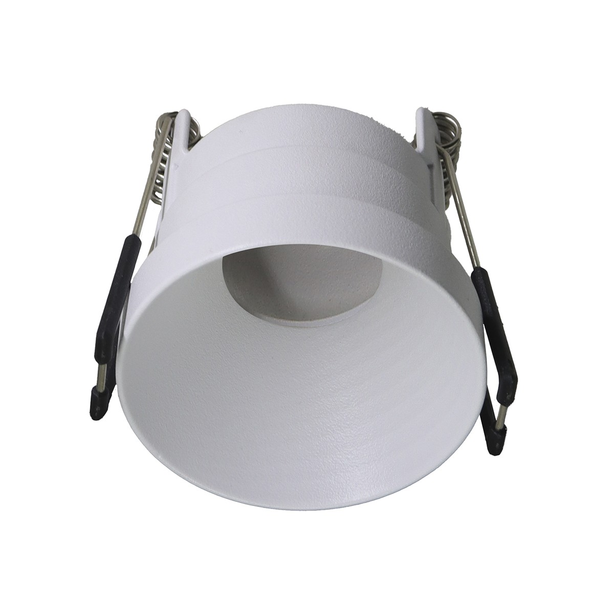 Round white recessed ceiling light. Fixed recessed downlight for functional indoor lighting. Circular design made of white textured aluminium. Recessed installation in the ceiling in a 4.80 -centimetre gap. Ideal for contract lighting projects in homes, shops, hotels and businesses. Includes lamp holder for GU10 PAR11 bulbs.