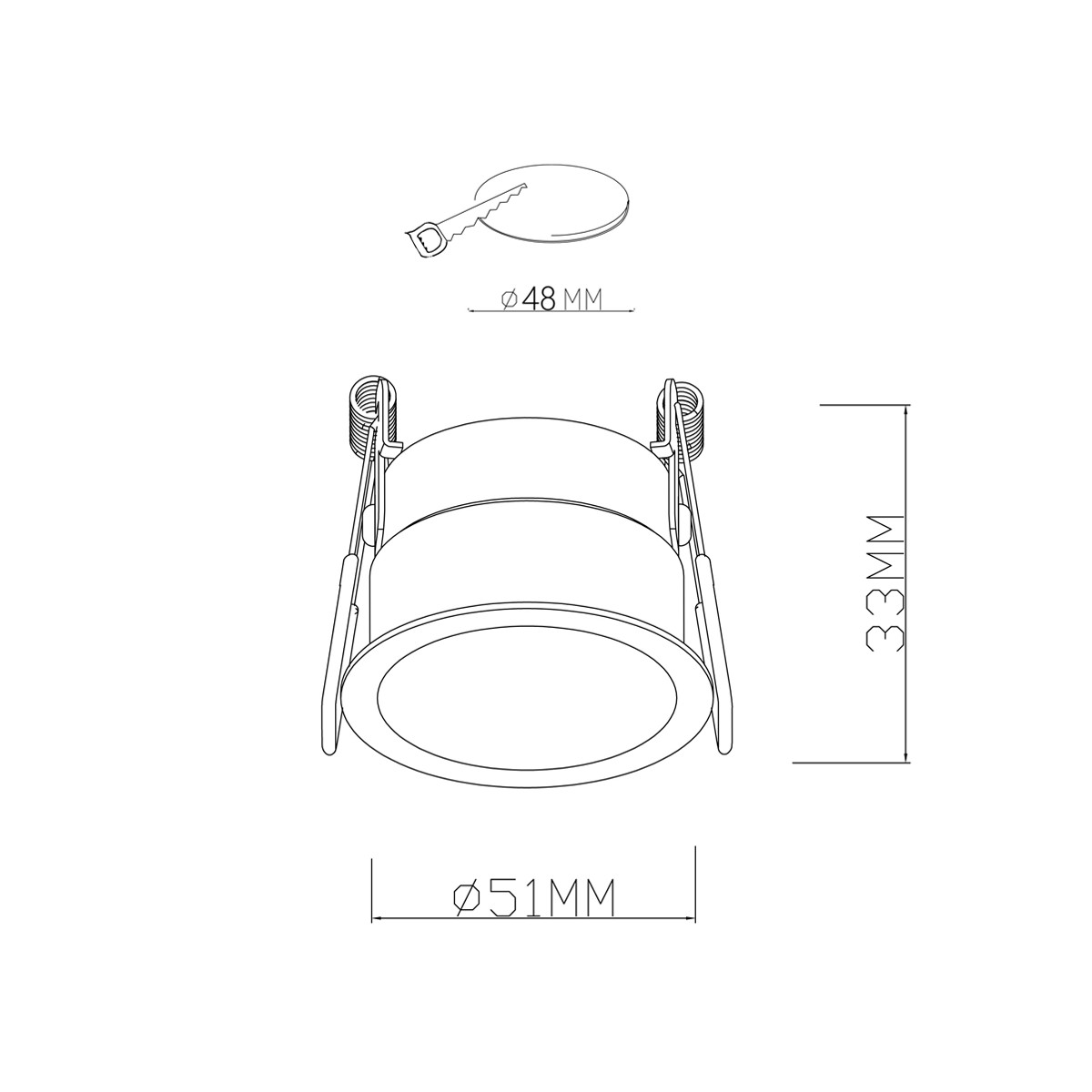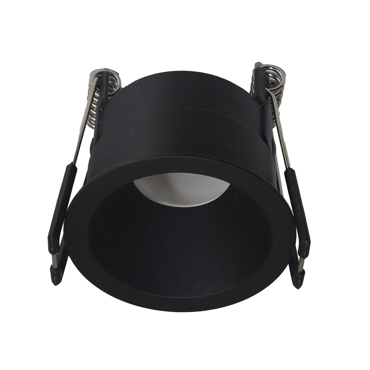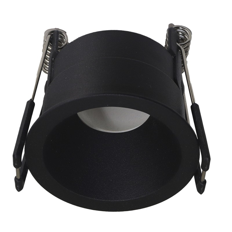 Round black recessed ceiling light. Fixed recessed downlight for functional indoor lighting. Circular design made of black textured aluminium. Recessed installation in the ceiling in a 4.80 -centimetre gap. Ideal for contract lighting projects in homes, shops, hotels and businesses. Includes lamp holder for GU10 PAR11 bulbs.
