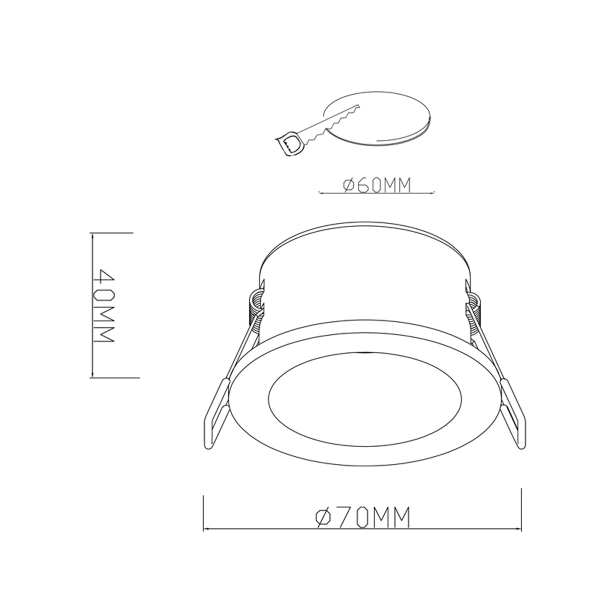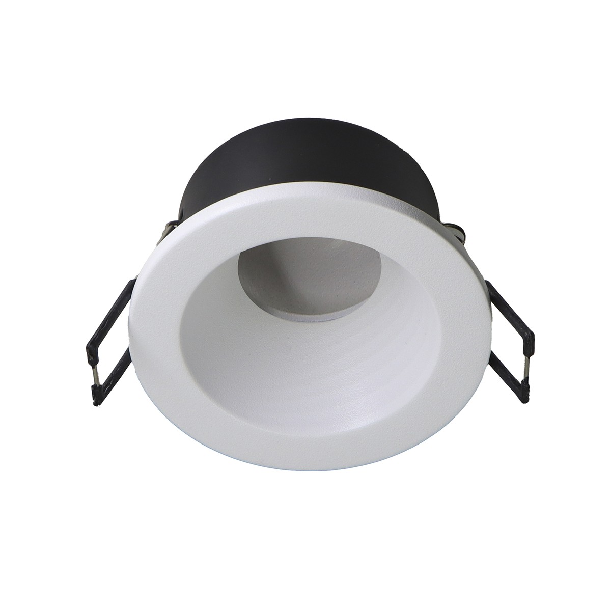 Round white recessed ceiling light. Fixed recessed light for functional indoor lighting. Circular design made of white textured aluminium. Recessed installation in the ceiling in a 6-centimetre gap. Ideal for contract lighting projects in homes, shops, hotels and businesses. Includes lamp holder for GU10 bulb.
