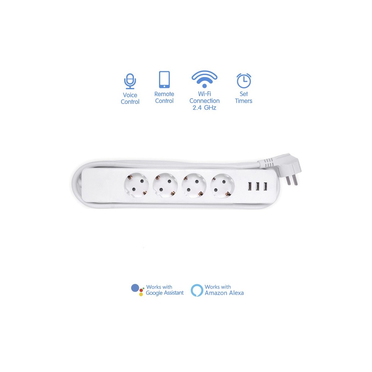 Smart strip compatible with Amazon Alexa and Google Assistant. Allows you to connect 4 plugs and 3 USB connections at the same time. It can be used from the App Tuya, turning it on and off manually or programming its on and off.