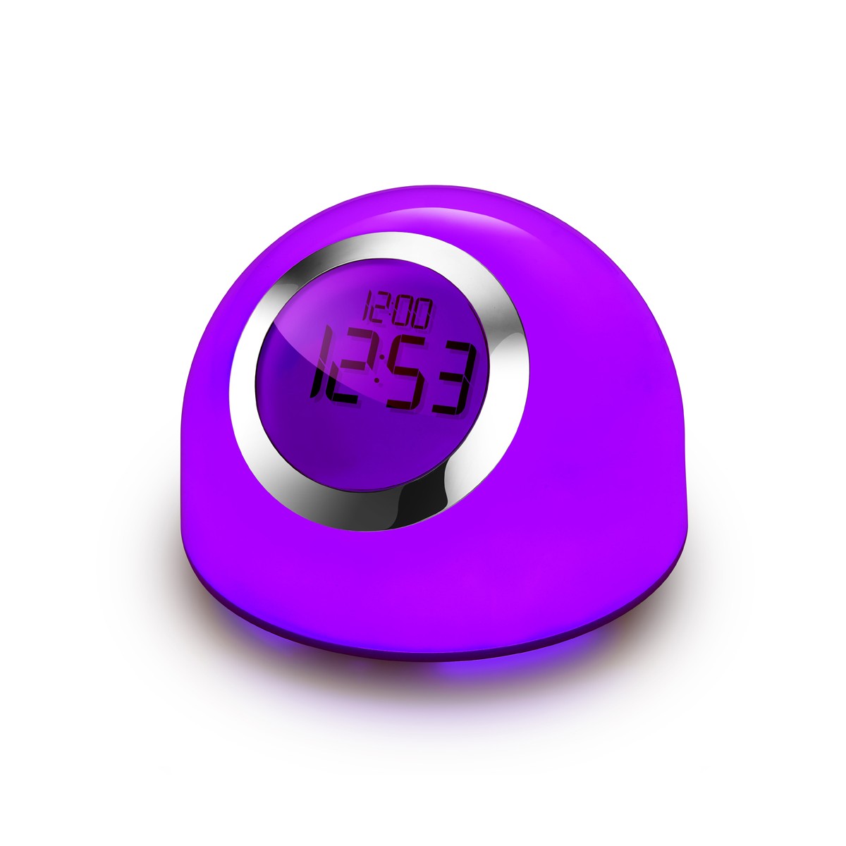 "All in" portable table lamp with the shape of a hemisphere and the latest LED technology. It includes dimmable white light all around and RGB illumination to use either as a table lamp or as an ambient night light. With touch control, it works by swiping your finger across the silver ring. It also has a large LED display with clock and alarm with snooze function. Great choice as a bedside lamp.