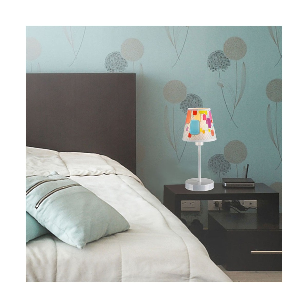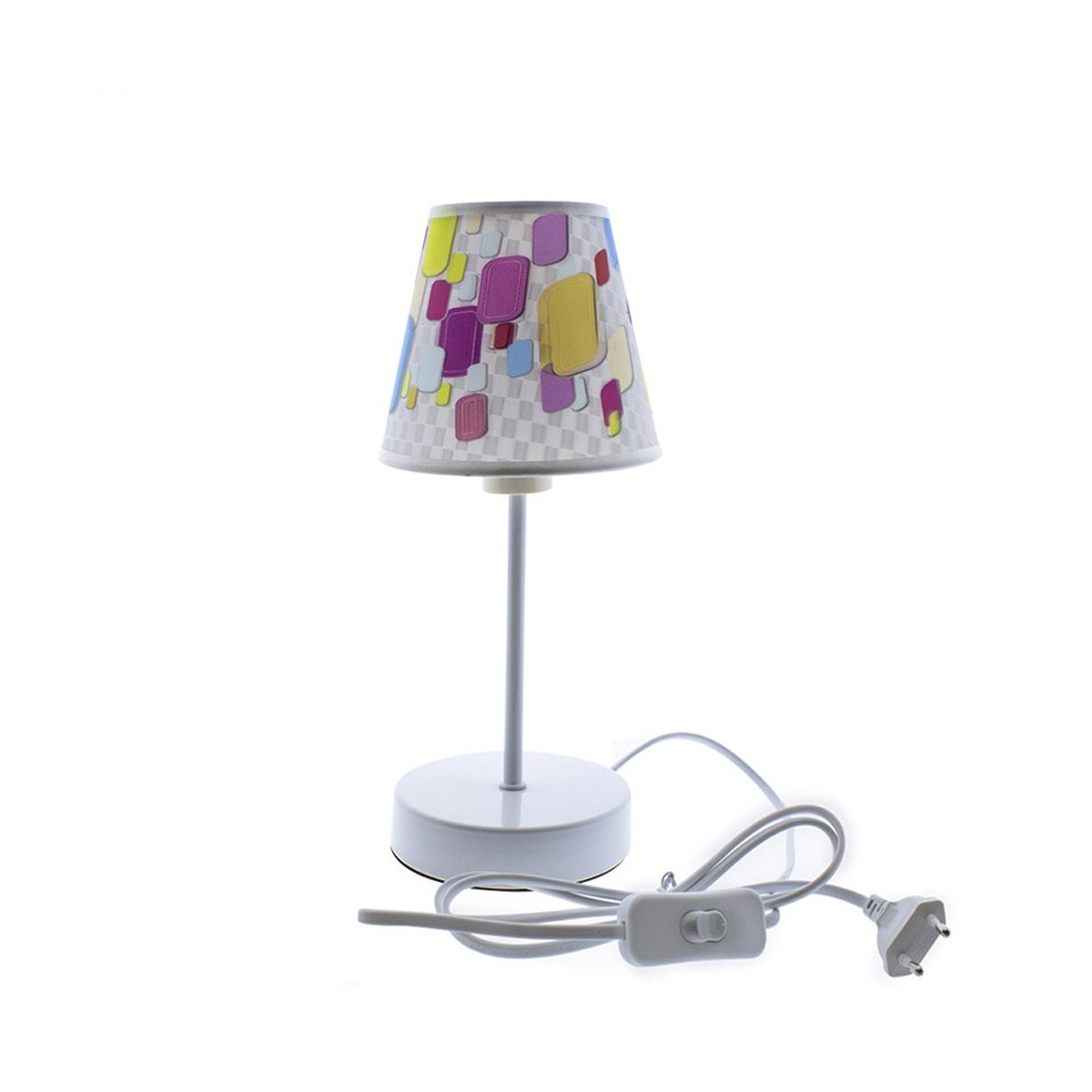 Children's Table Lamp with geometric drawings of various colours on the shade made of plastic and white foot. Ideal for decorating children's rooms. Easy replacement of the bulb. Holographic lamp shade