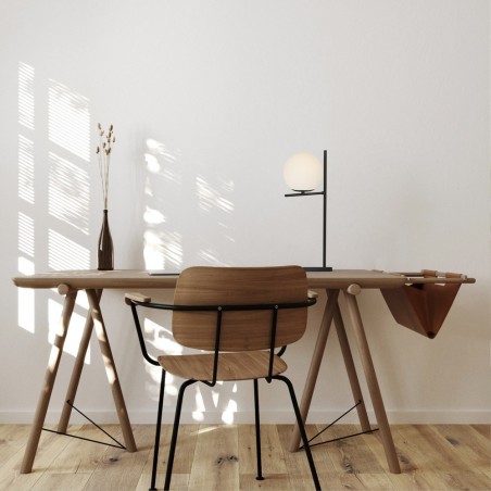 Boston decorative table lamp. Minimalist table lamp with a black metal structure and opal glass lampshade in the shape of a sphere. Ideal for placing on the bedside table next to the bed or on a side table in the living room. It can hold an E14 LED bulb.