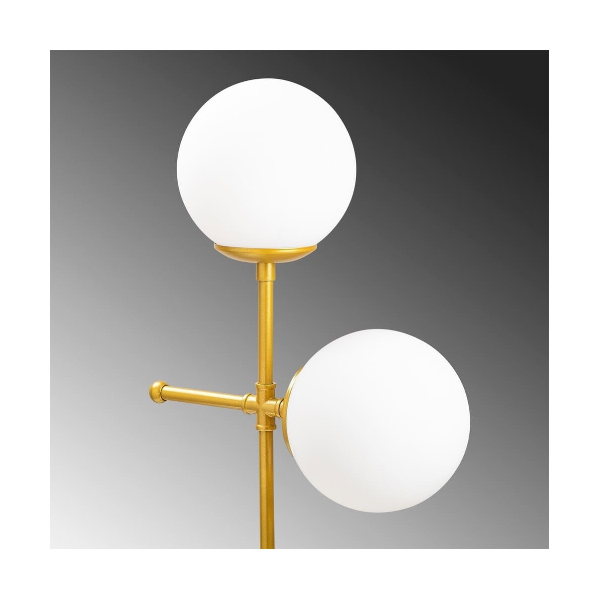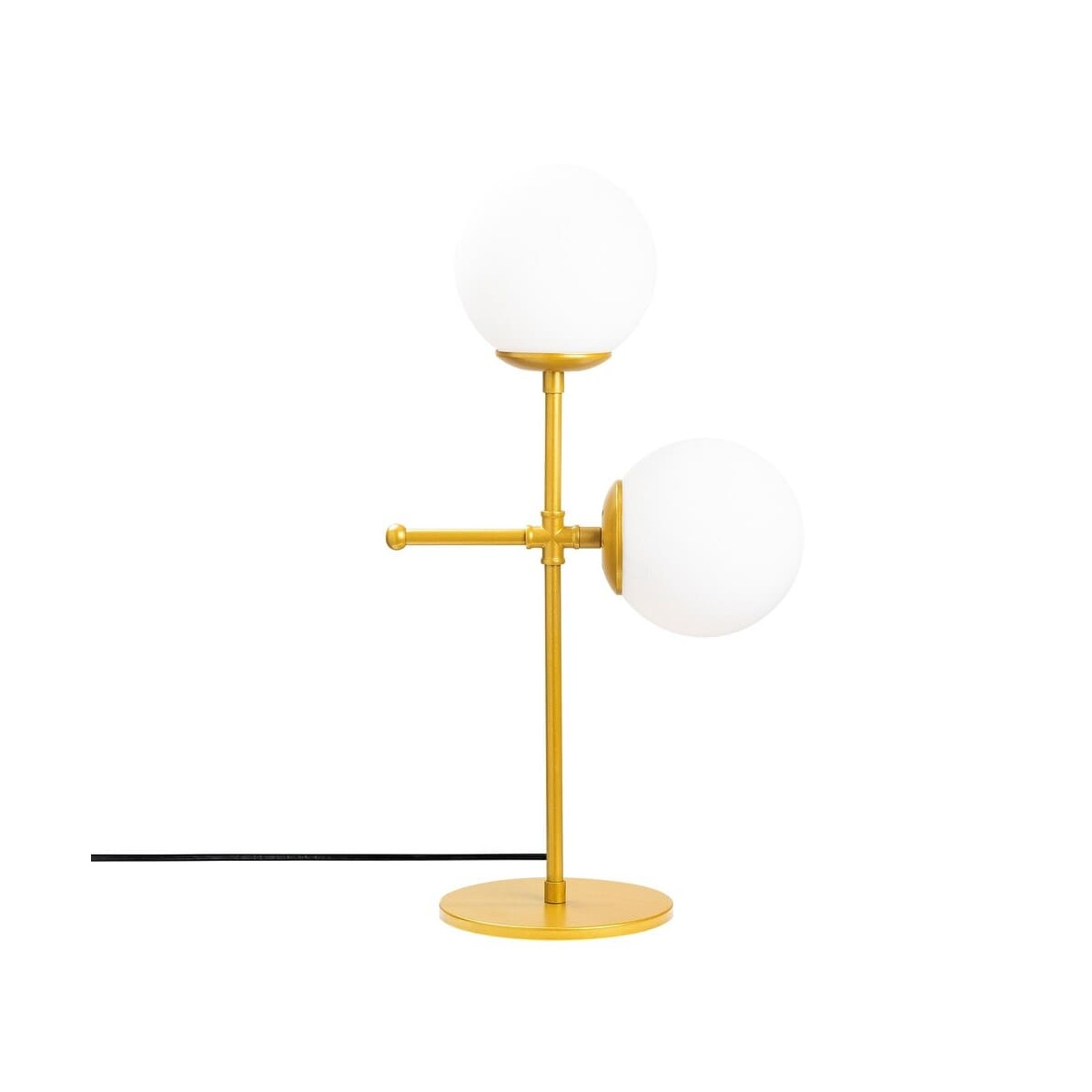Metallic table lamp with gold finish and two lights with a matt white glass shade. The round base of the lamp measures 12 cm. The total height is 55 cm. Bulbs not included.