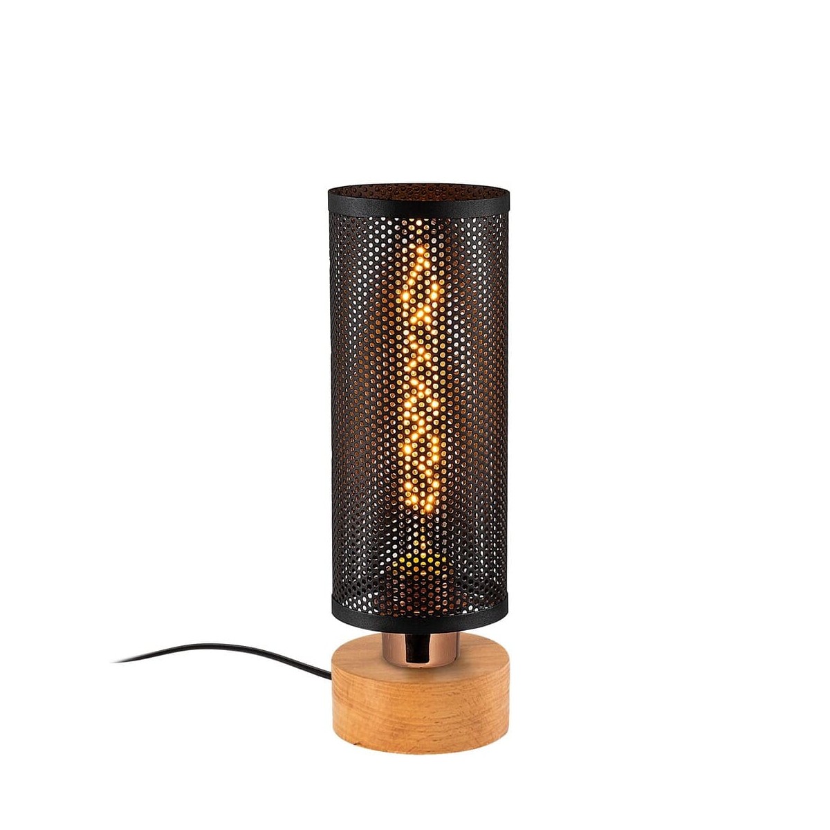 Decorative table lamp with an industrial style light with round wooden base and 250cm cable. The metal lampshade dims to a cage. For E27 led bulb not included.