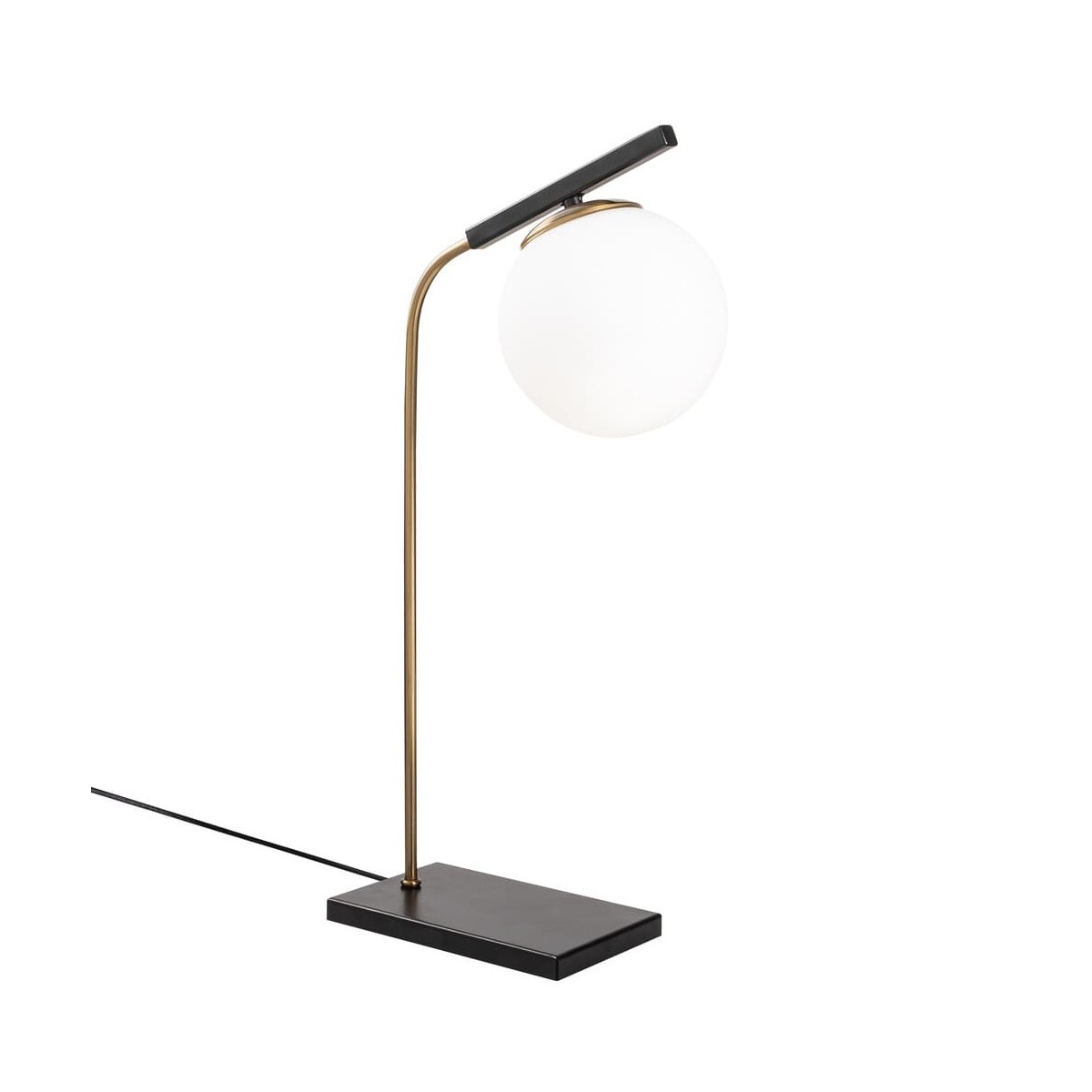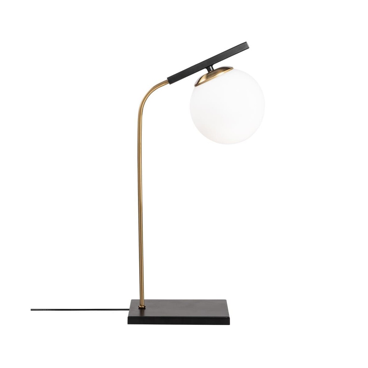 Decorative table lamp. Made of black and gold lacquered metal with a matt white glass shade. It works with an E27 bulb, not included.