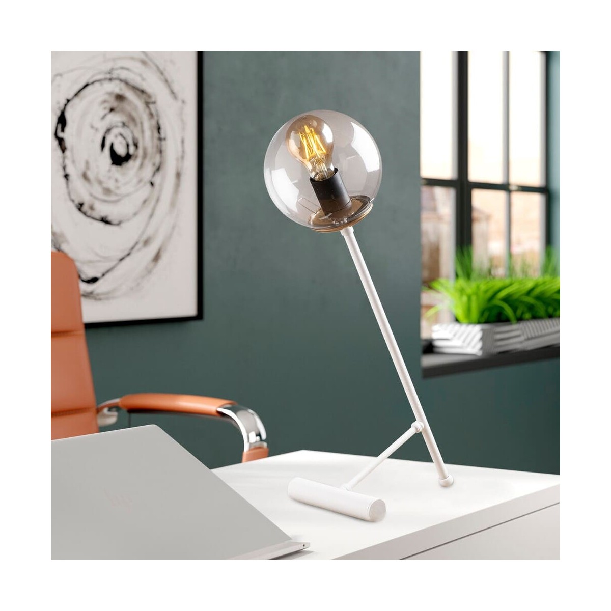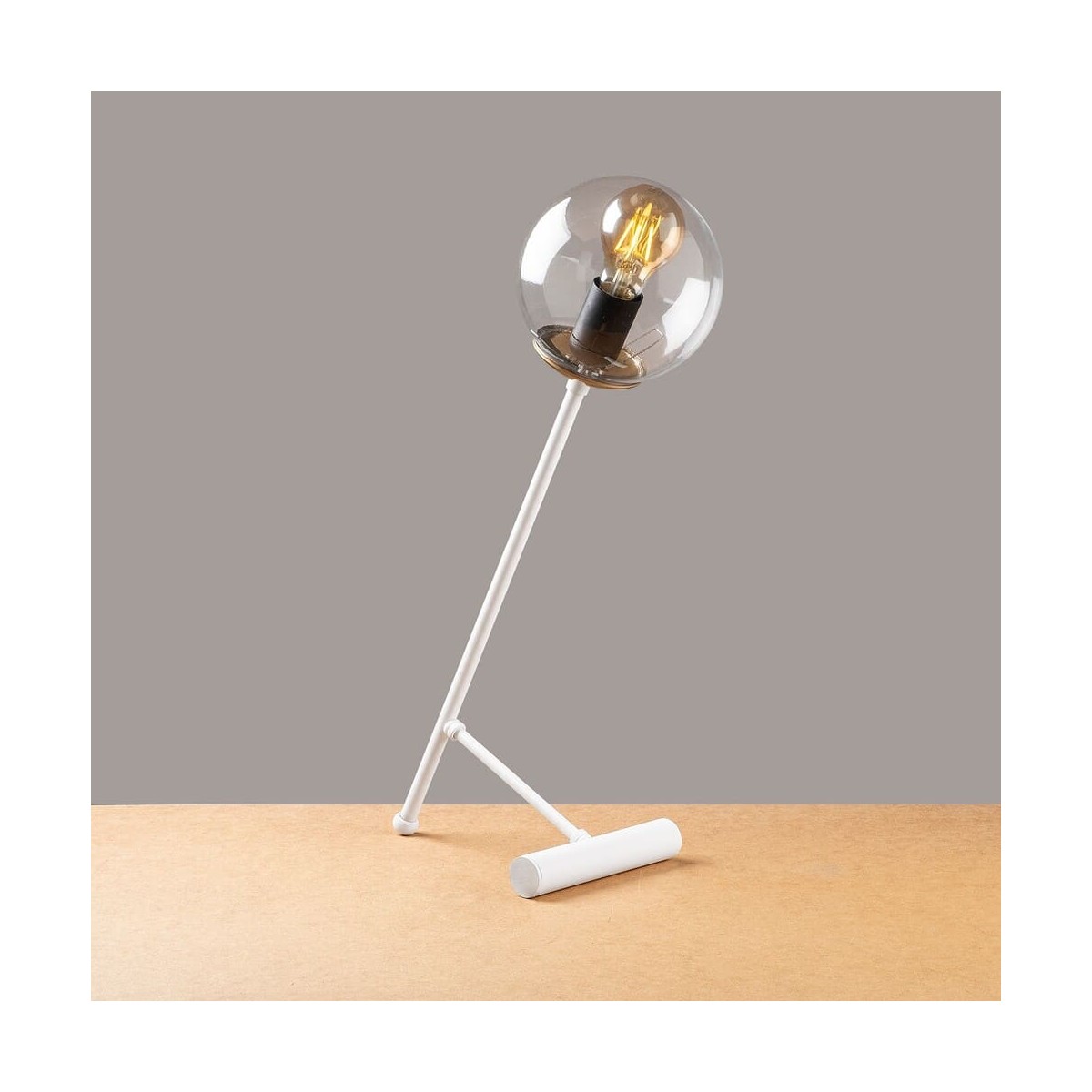 Decorative table lamp with a simple design, made of matt white lacquered metal with a spherical transparent glass shade. It works with an E27 bulb, not included.