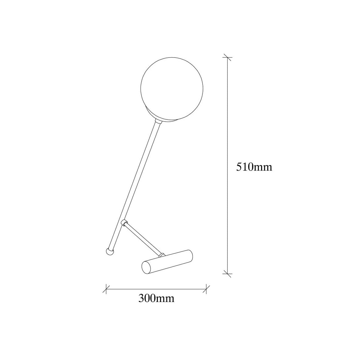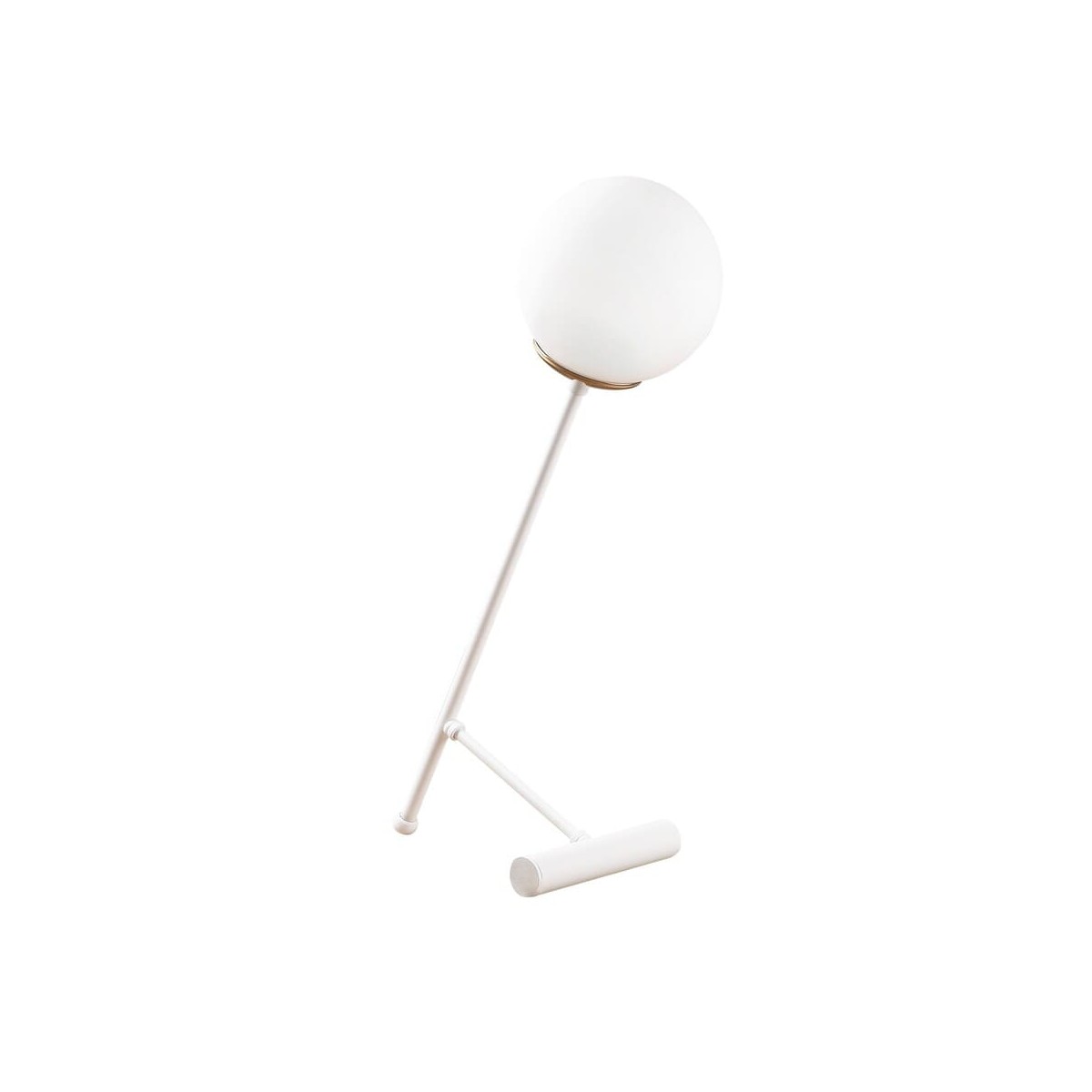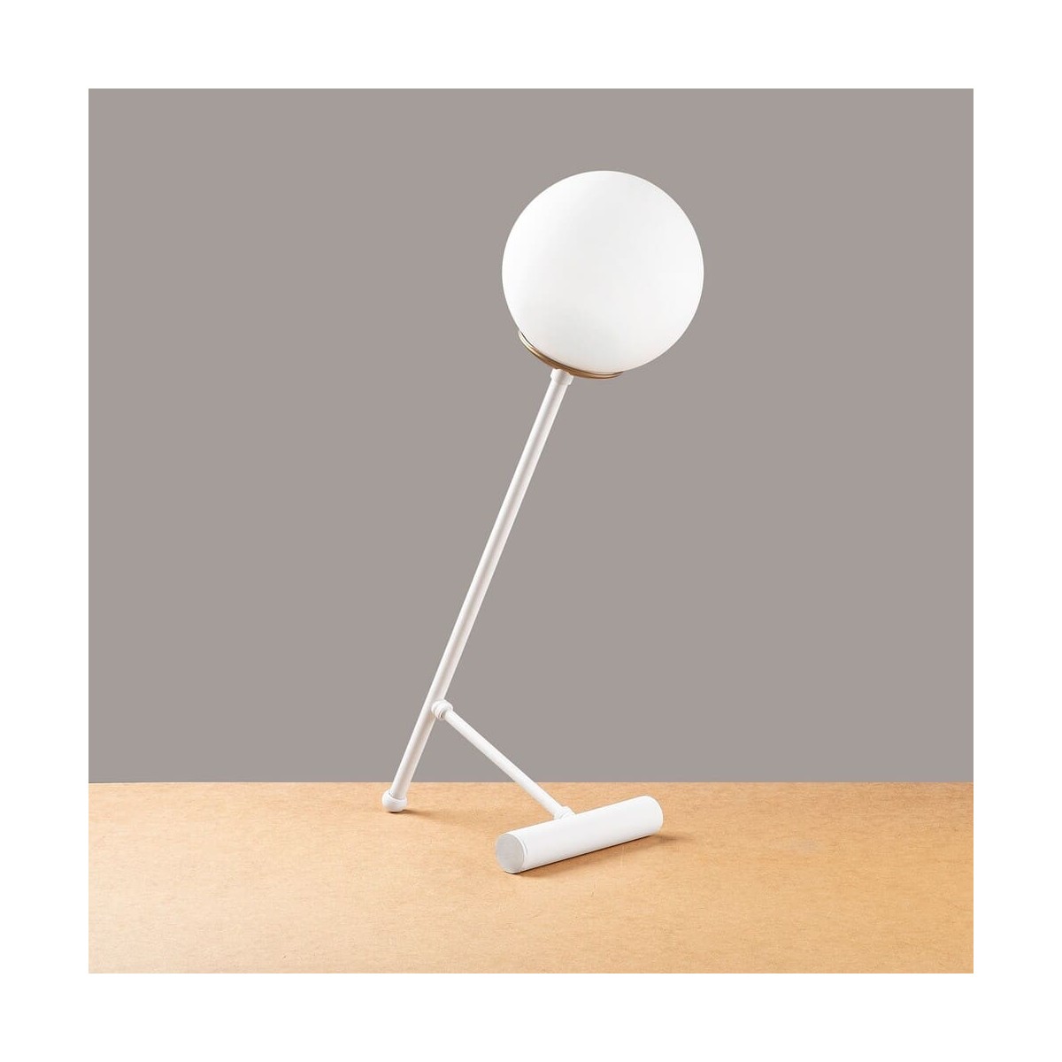 Decorative table lamp with a simple design, made of matt white lacquered metal with a spherical shade in matt white glass. It works with an E27 bulb, not included.